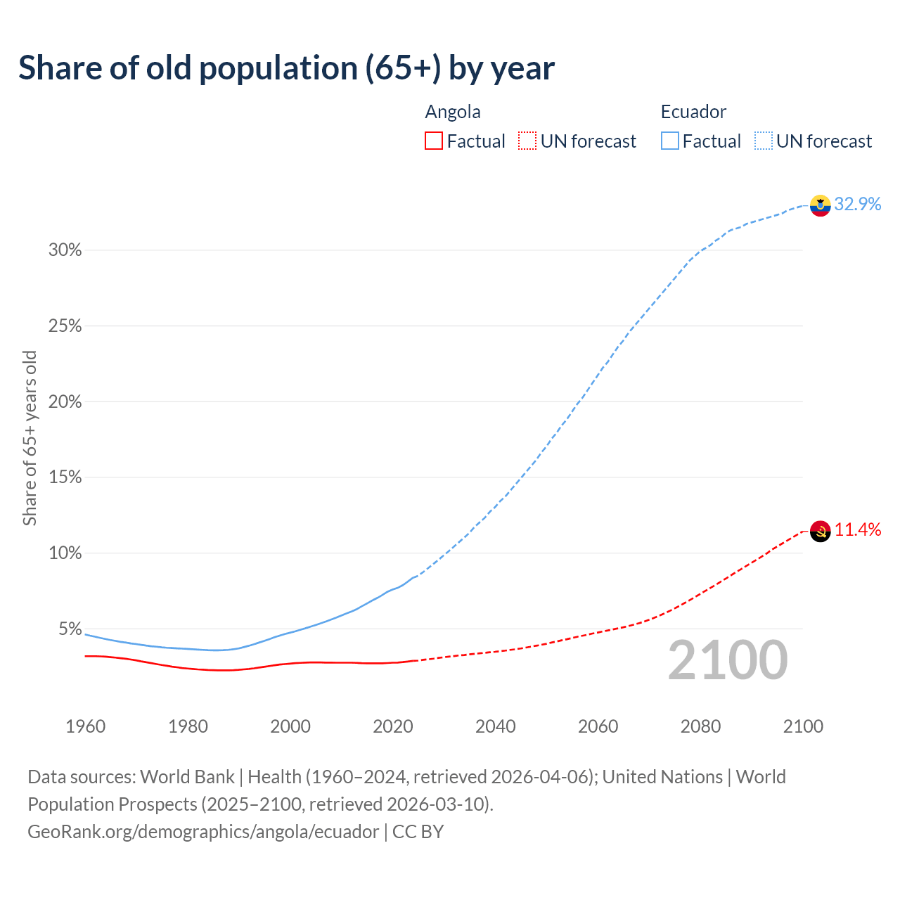 The share of older people aged 65 and over is 2.85% in Angola and 8.34% in Ecuador. Life expectancy in Angola compared to Ecuador .