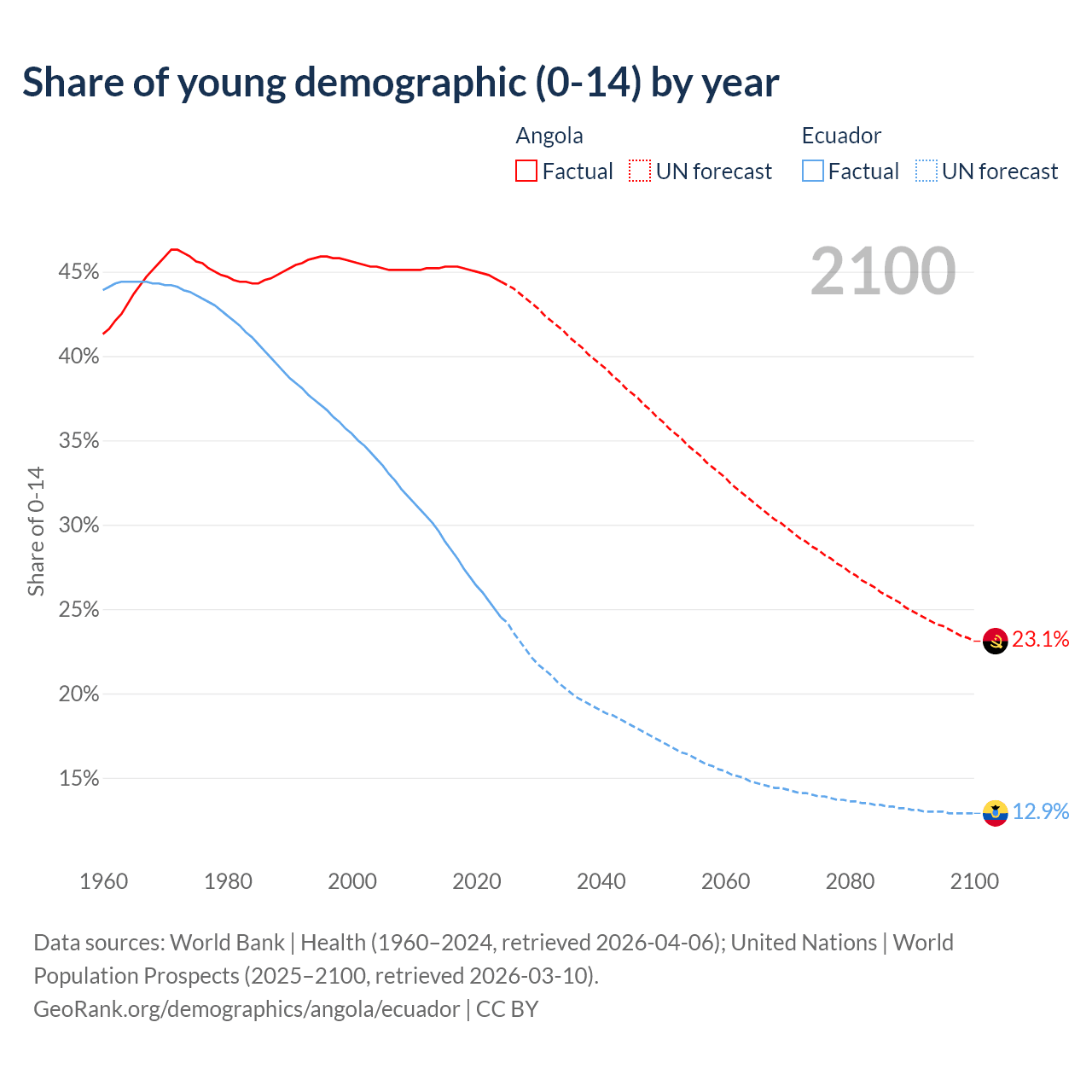 - The share of young demographic (0-15 years old) in Angola is 44.4% vs 24.5% in Ecuador.