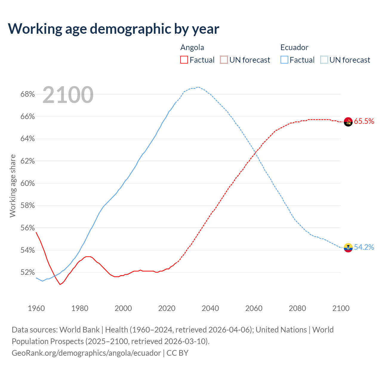 Median age Angola vs Ecuador, 1960-2100