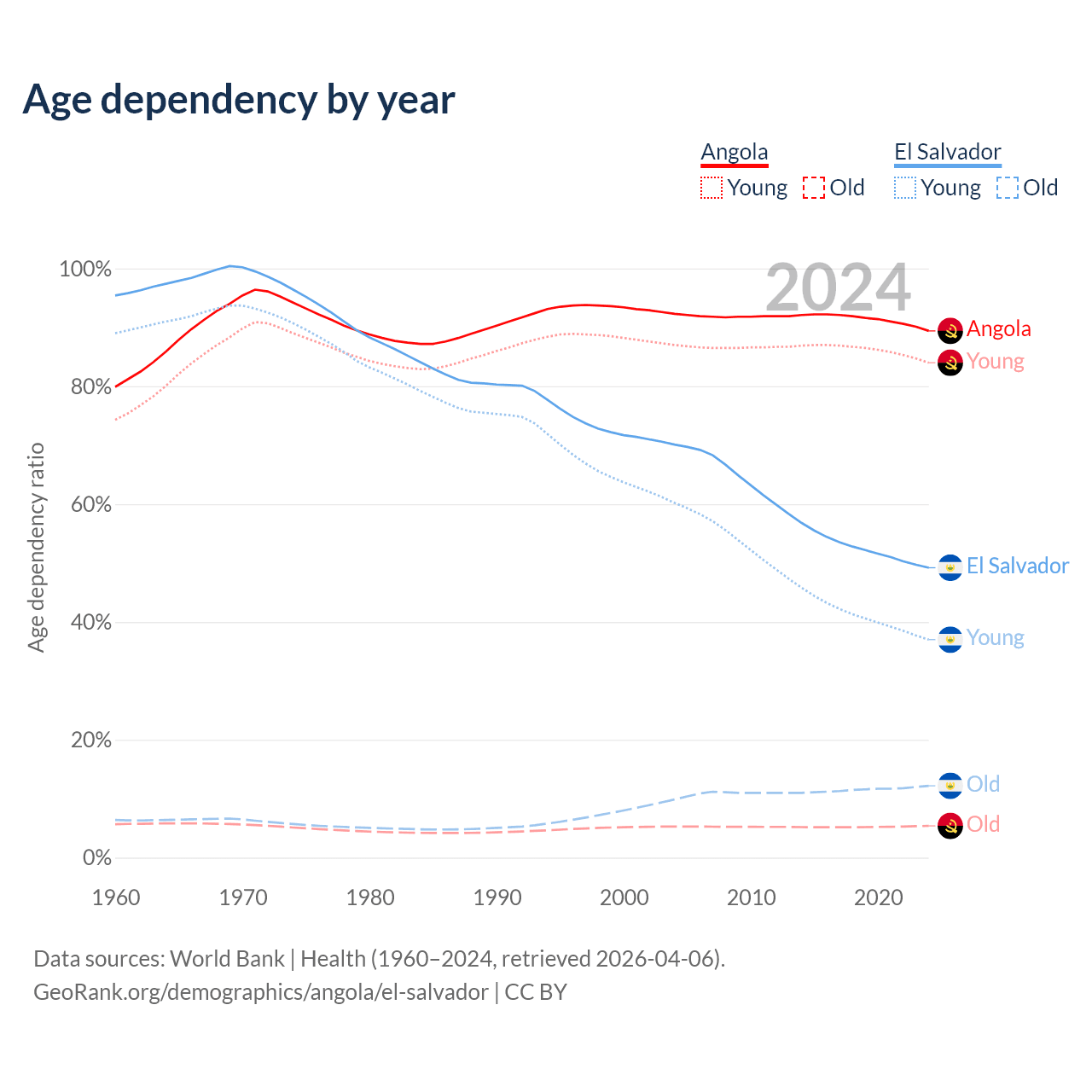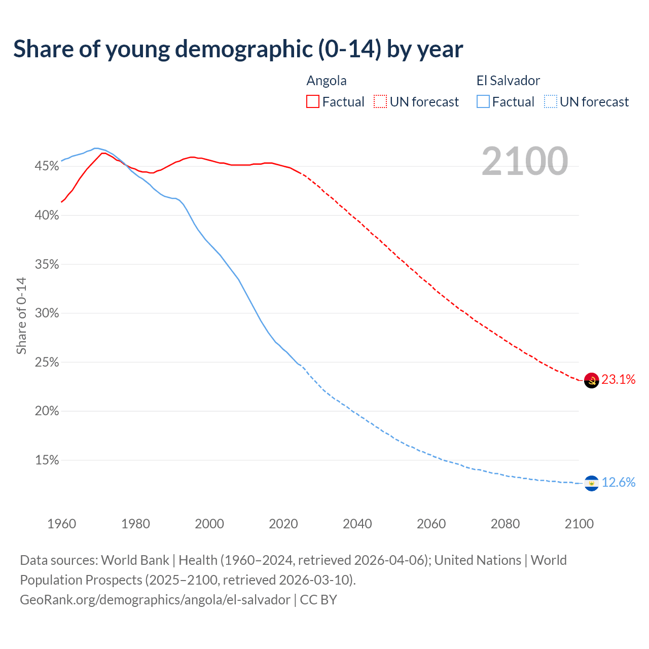 - The share of young demographic (0-15 years old) in Angola is 44.4% vs 24.8% in El Salvador.