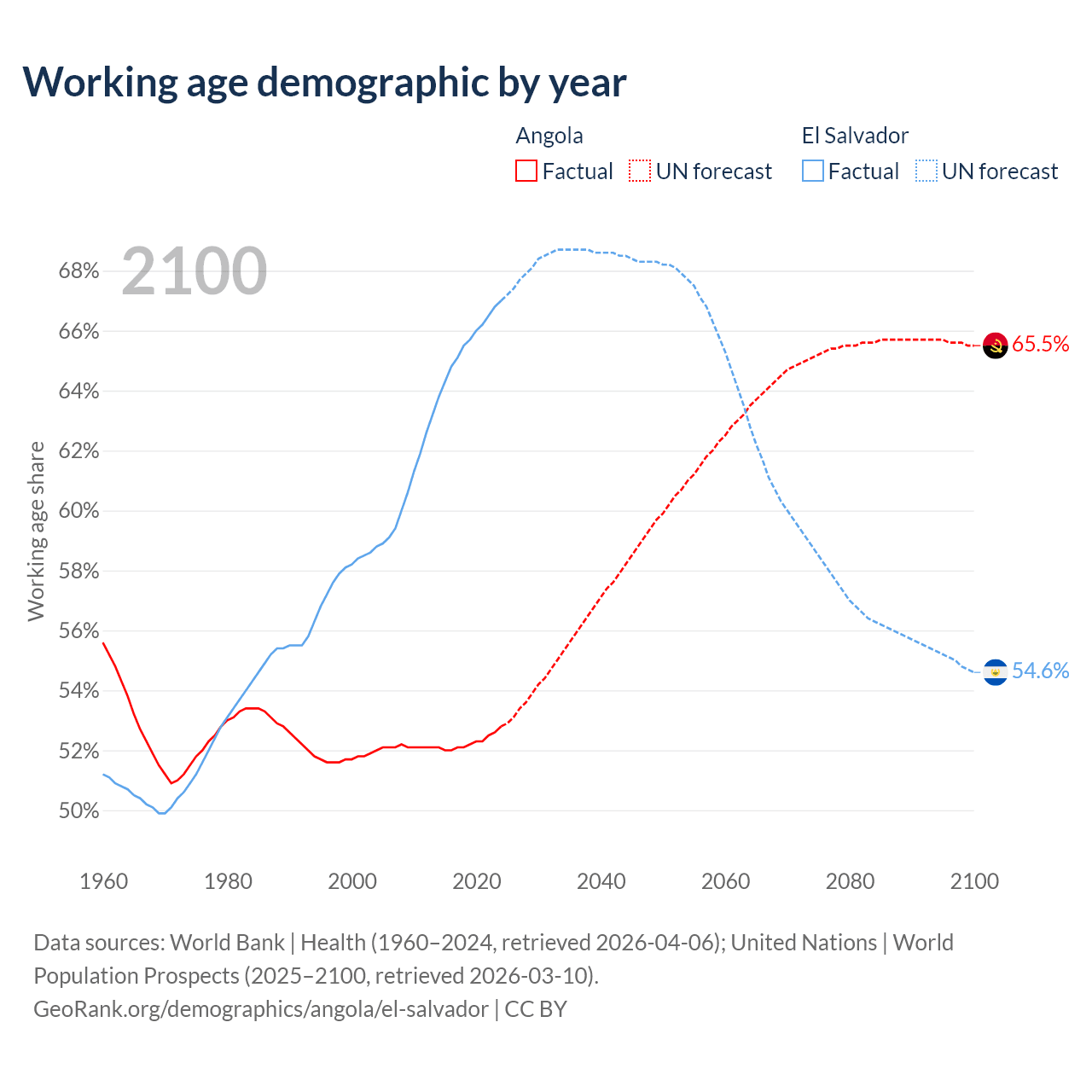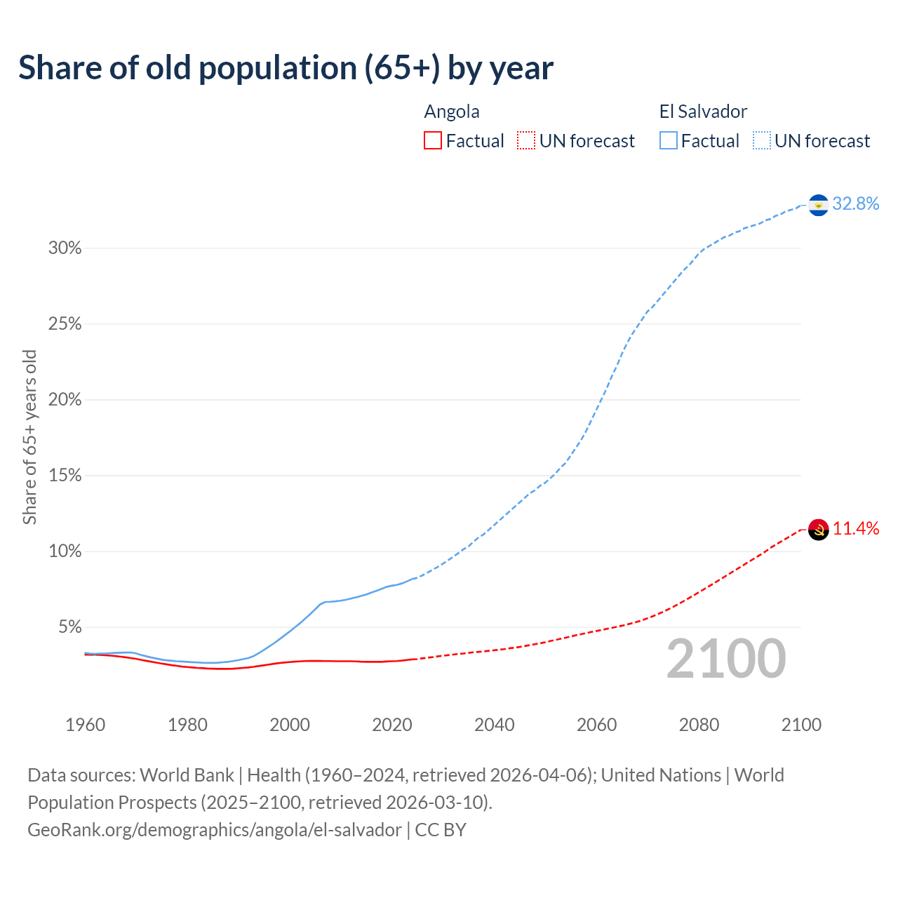 The share of older people aged 65 and over is 2.85% in Angola and 8.15% in El Salvador. Life expectancy in Angola compared to El Salvador .