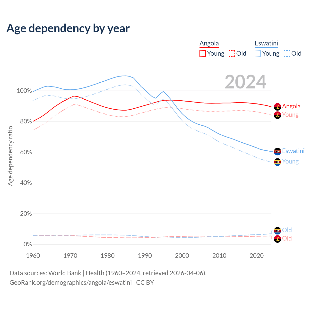 The share of older people aged 65 and over is 2.85% in Angola and 4.26% in Eswatini. Life expectancy in Angola compared to Eswatini .