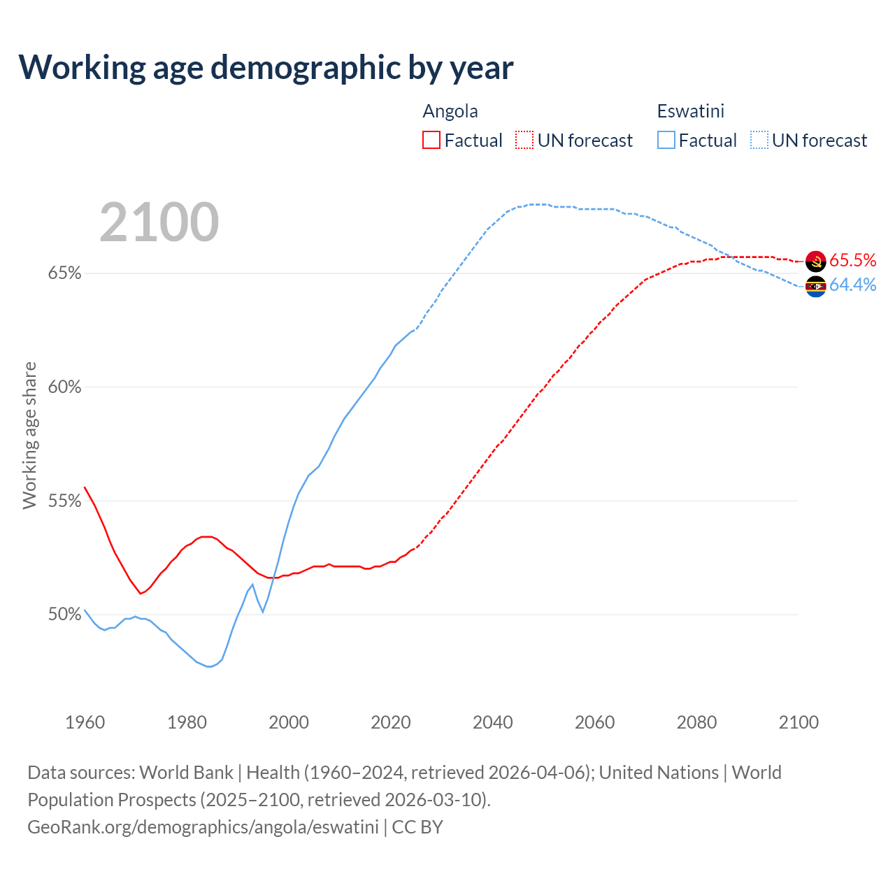 - Angola has 21.4M working age adults (aged 15-64) vs 794K in Eswatini.