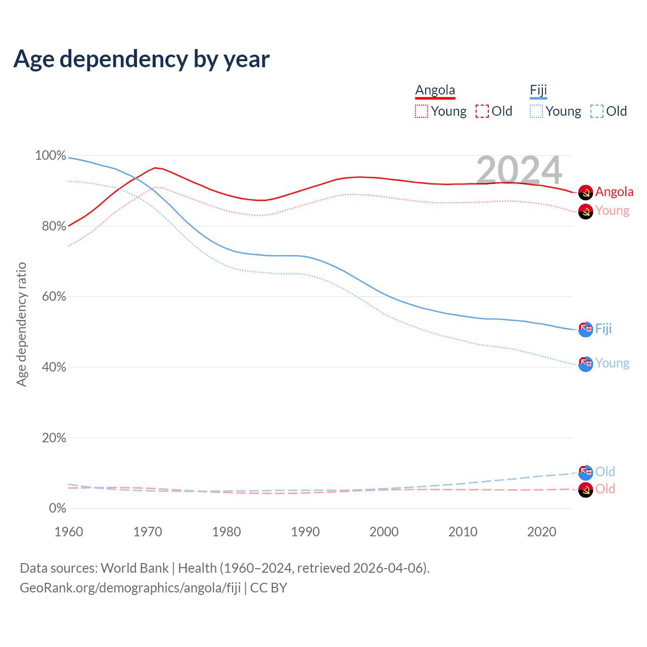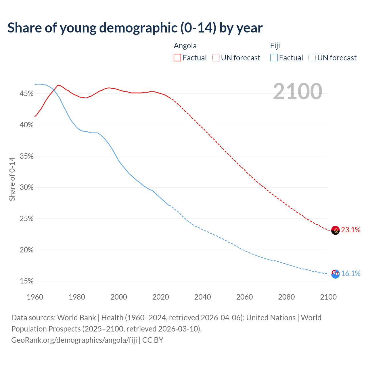 - The share of young demographic (0-15 years old) in Angola is 44.4% vs 27.1% in Fiji.