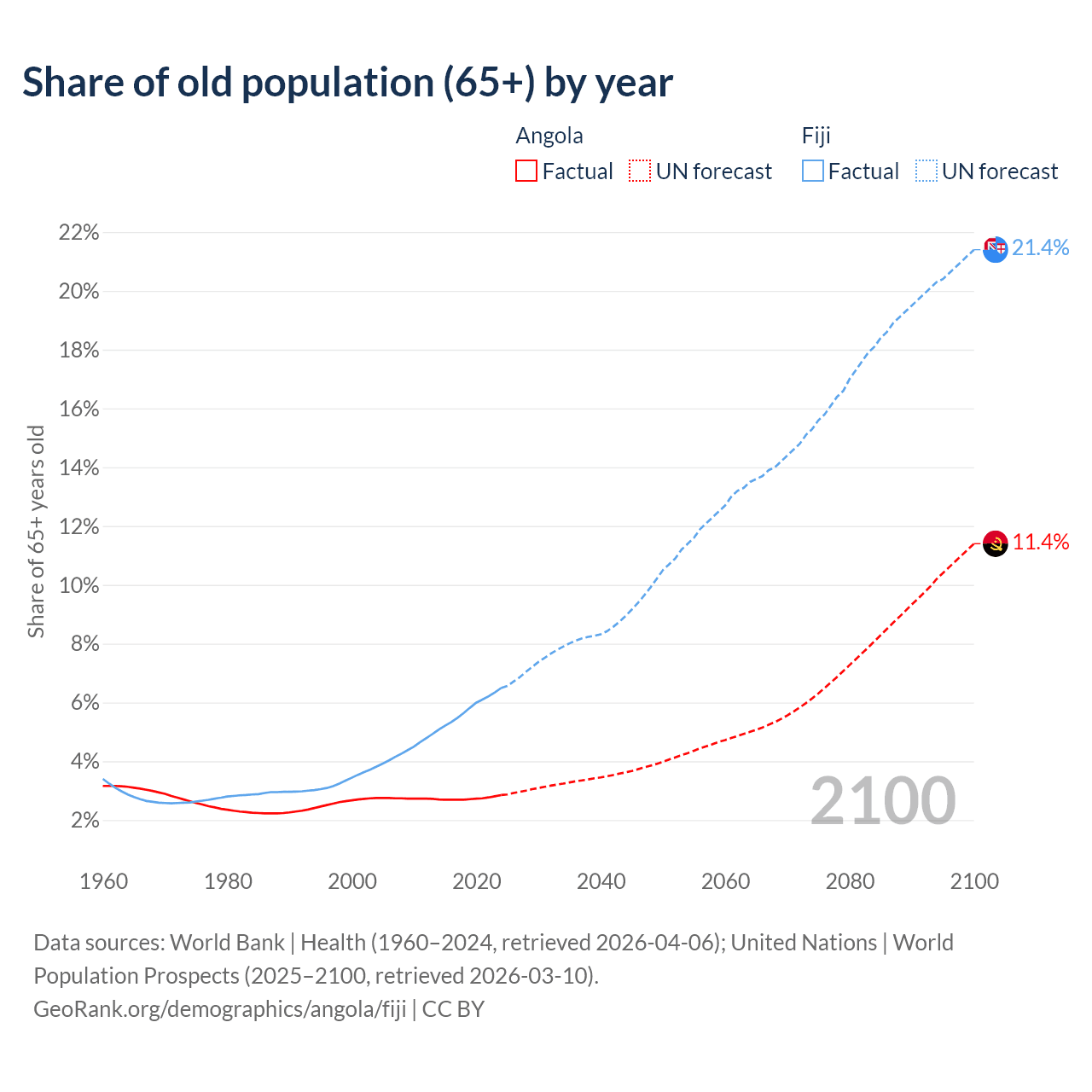 - The share of old-age demographic (65+) in Angola is 2.85% vs 6.49% in Fiji.