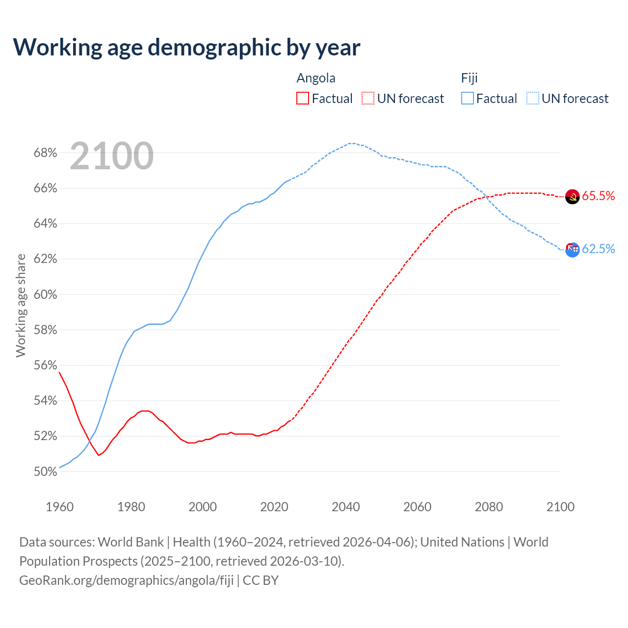 - Angola has 21.4M working age adults (aged 15-64) vs 623K in Fiji.