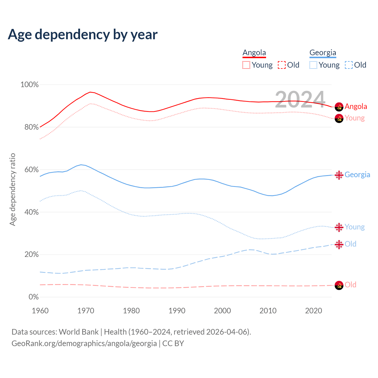The share of older people aged 65 and over is 2.85% in Angola and 15.6% in Georgia. Life expectancy in Angola compared to Georgia .