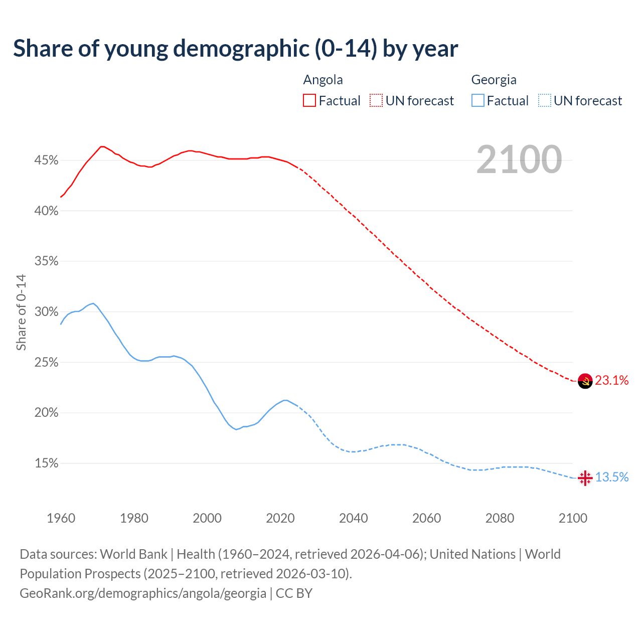 - The share of young demographic (0-15 years old) in Angola is 44.4% vs 20.8% in Georgia.