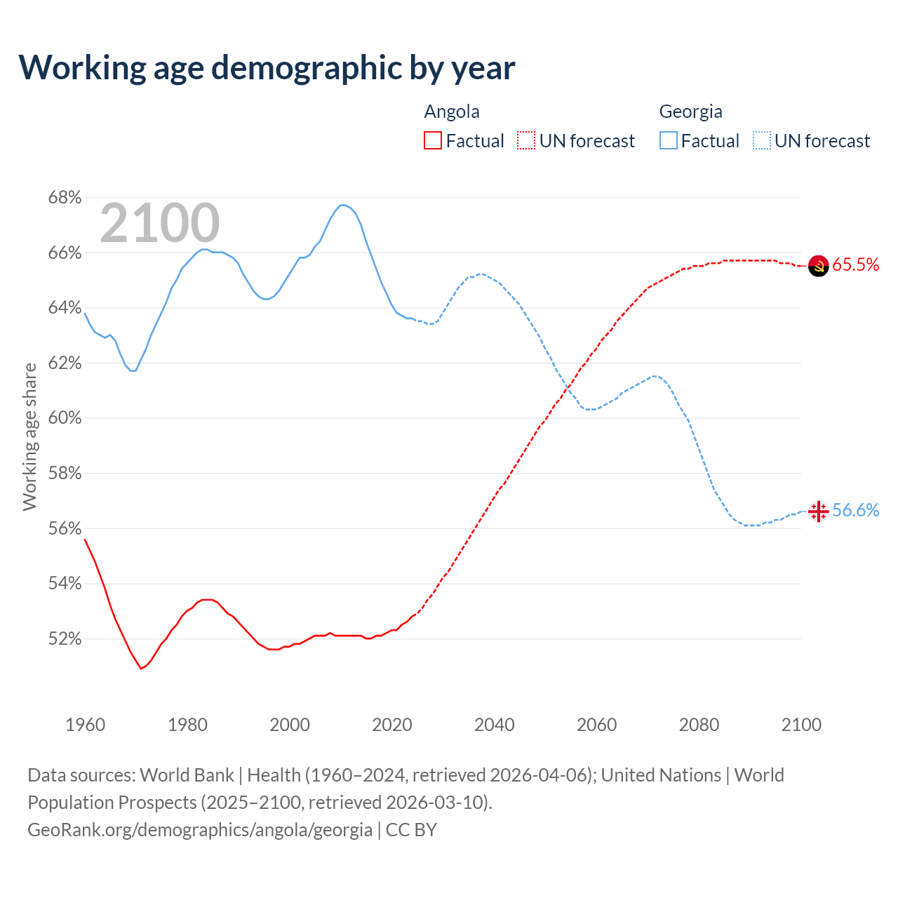 Median age Angola vs Georgia, 1960-2100