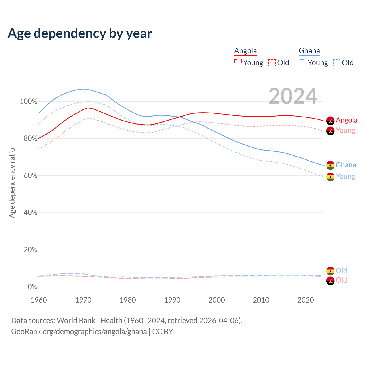 - Angola is ranked 188/196 by median age (oldest to youngest) vs 146/196 for Ghana.