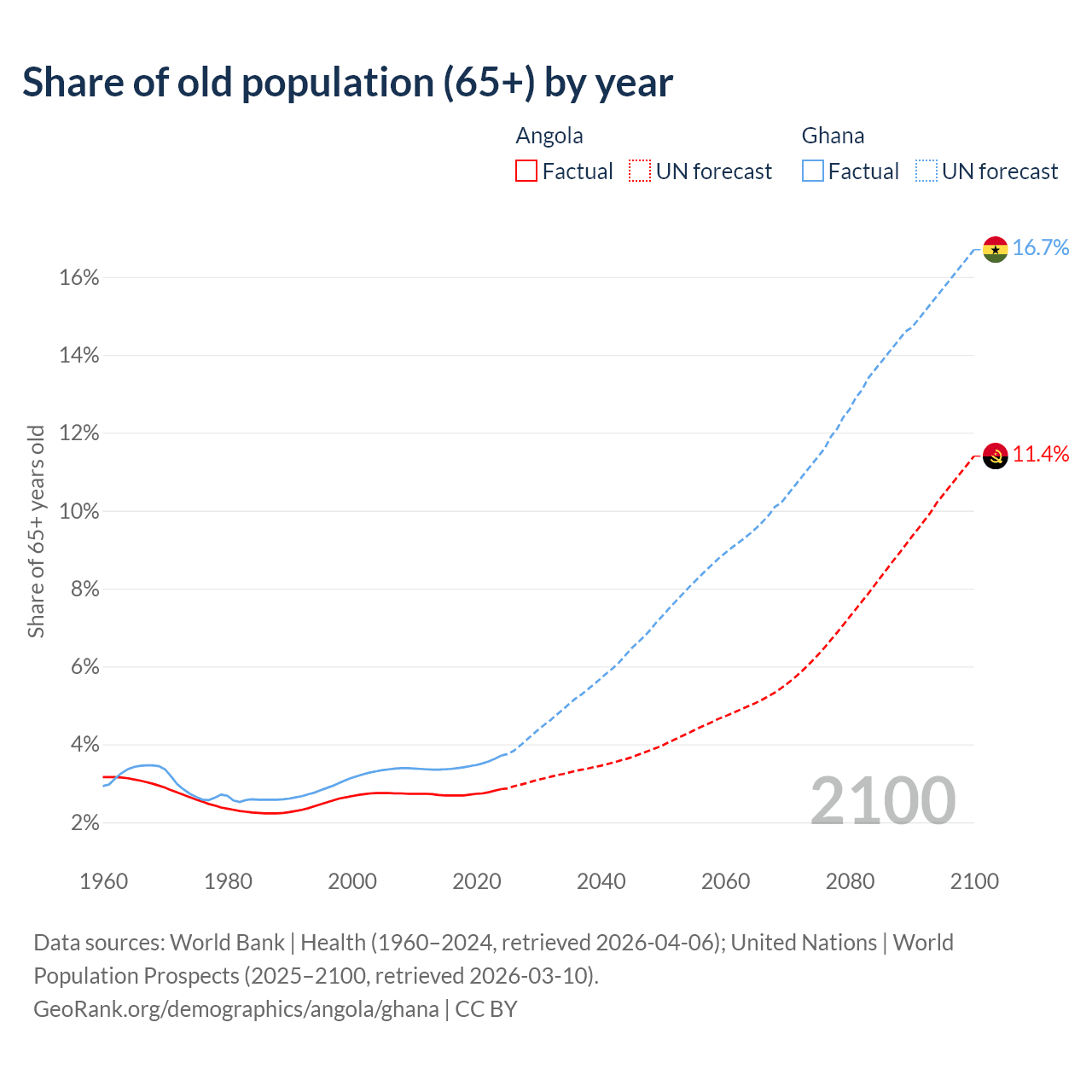 The share of older people aged 65 and over is 2.85% in Angola and 3.71% in Ghana. Life expectancy in Angola compared to Ghana .