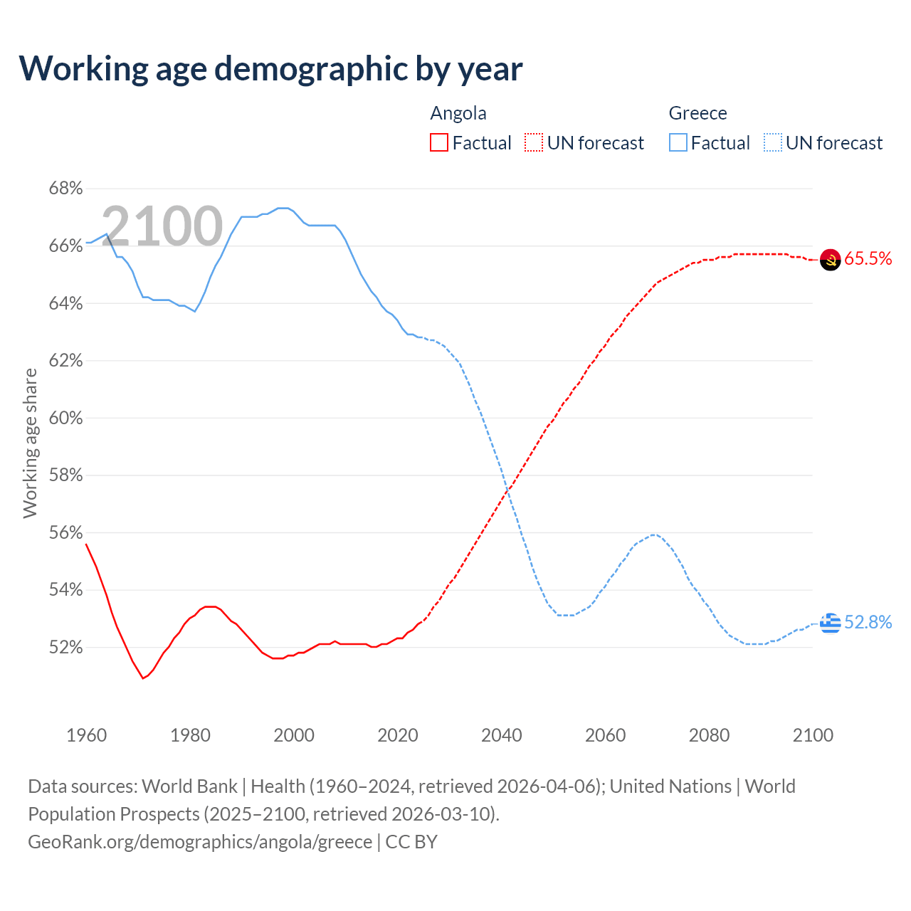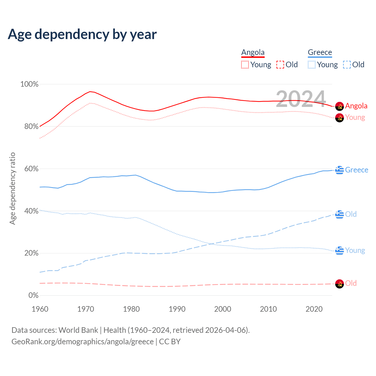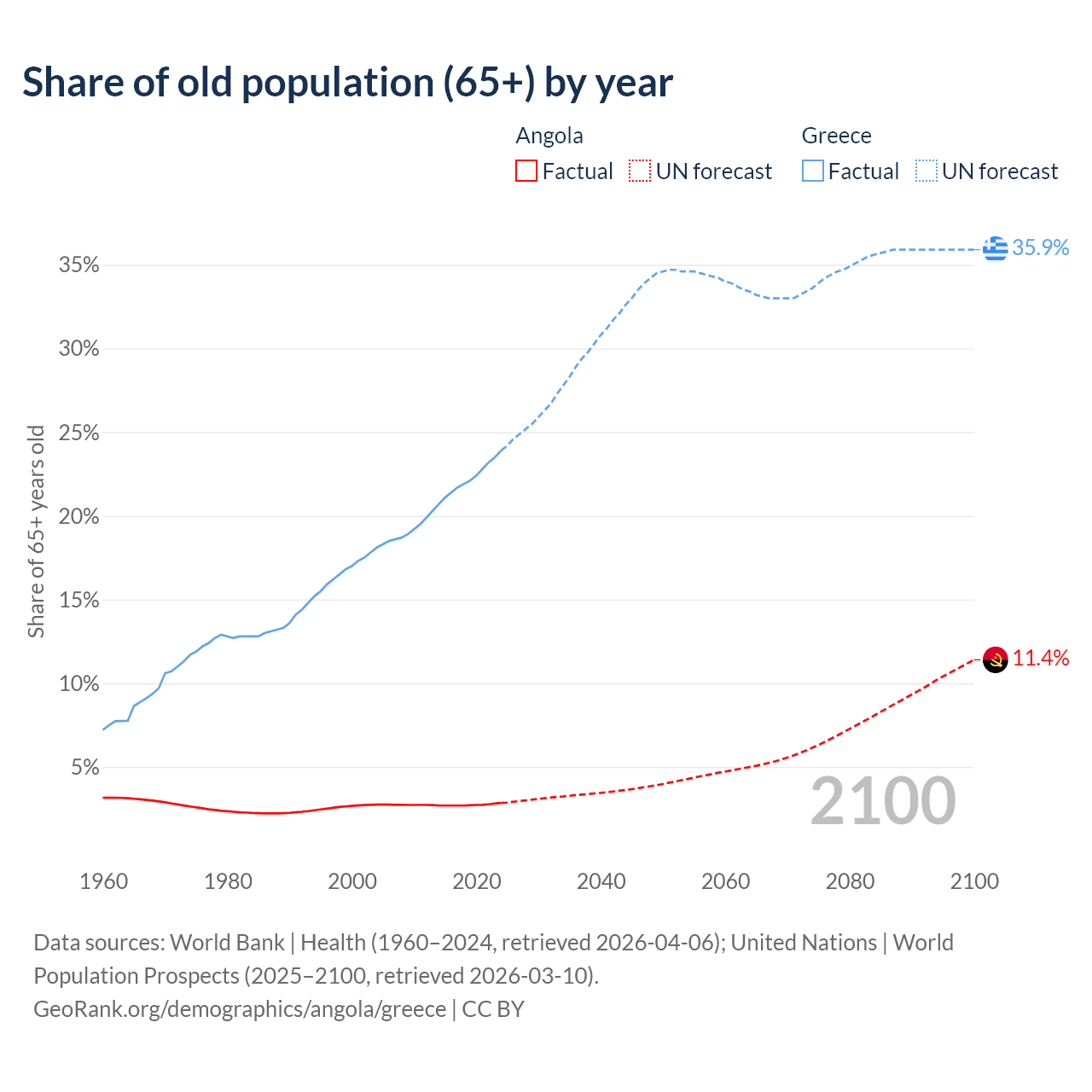The share of older people aged 65 and over is 2.85% in Angola and 23.9% in Greece. Life expectancy in Angola compared to Greece .