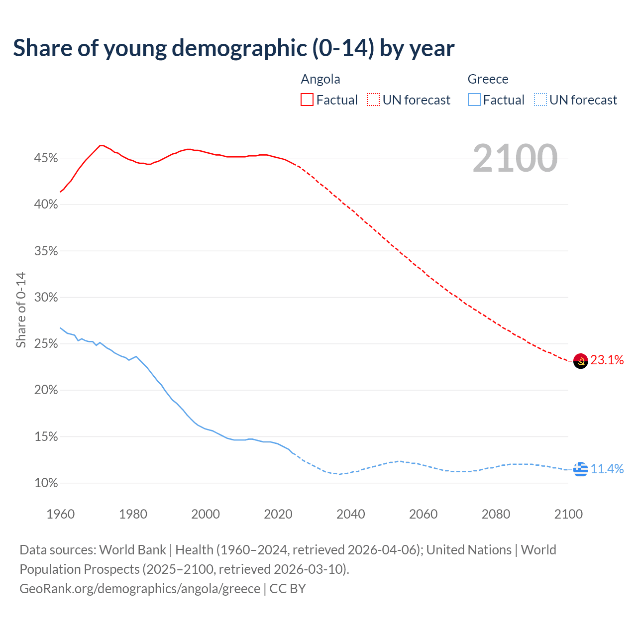 - The share of young demographic (0-15 years old) in Angola is 44.4% vs 13.2% in Greece.