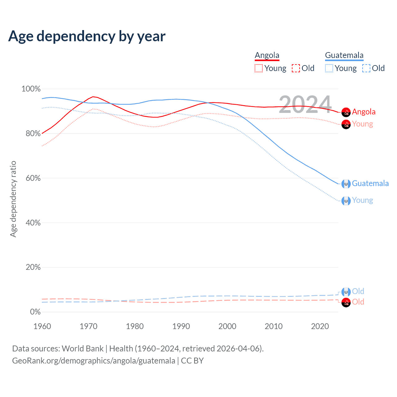 - Angola is ranked 188/196 by median age (oldest to youngest) vs 137/196 for Guatemala.