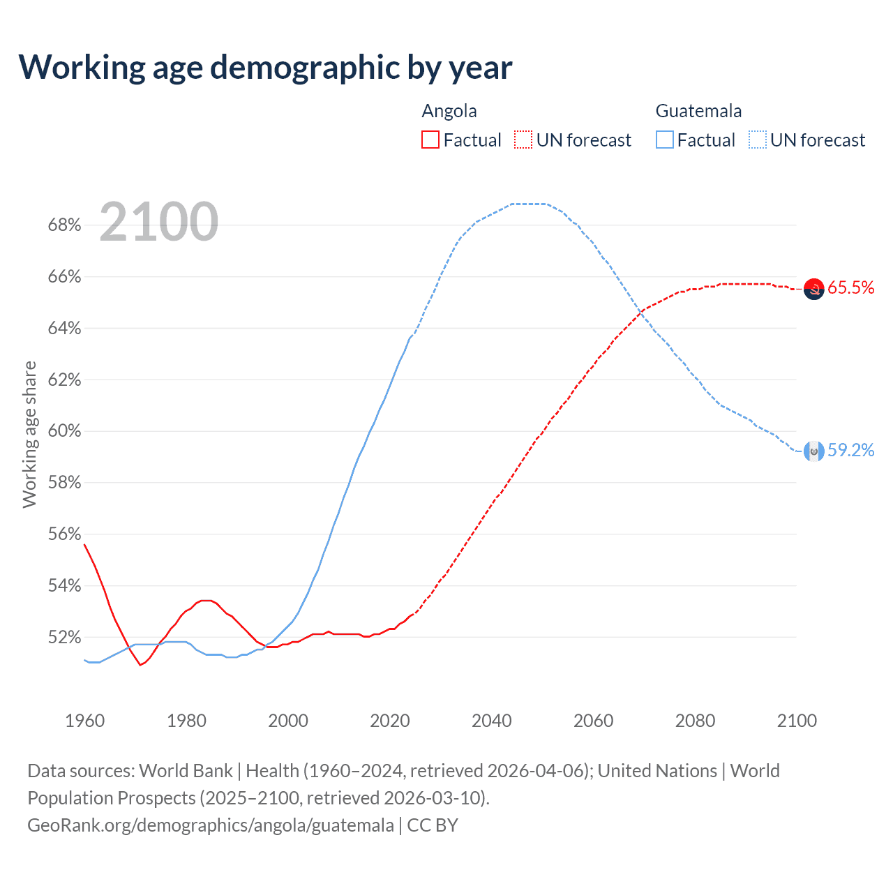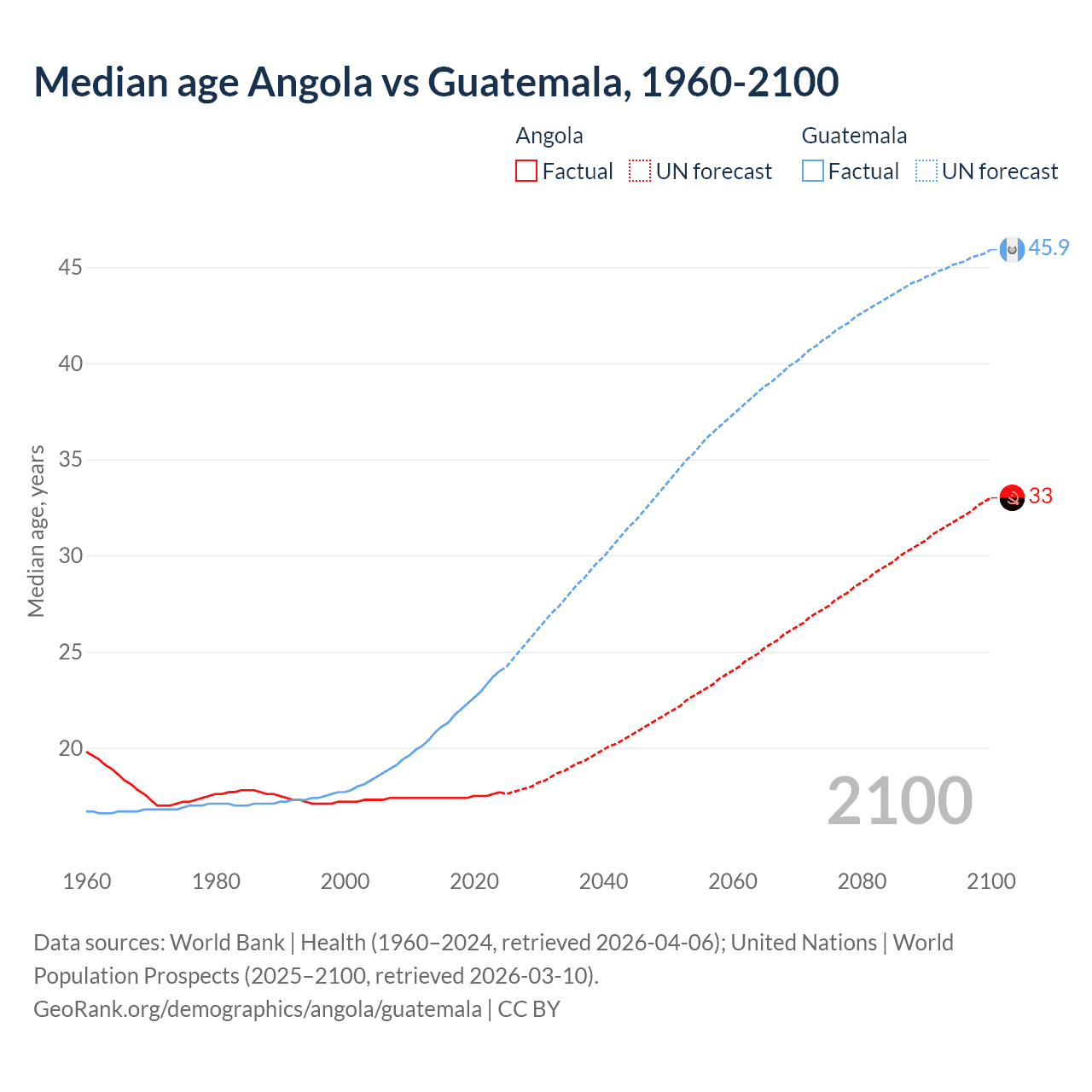 Median age Angola vs Guatemala, 1960-2100