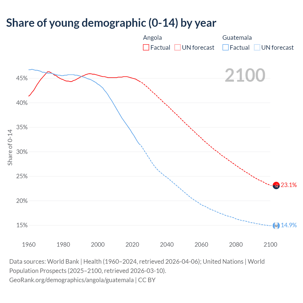 - The share of young demographic (0-15 years old) in Angola is 44.4% vs 31.6% in Guatemala.