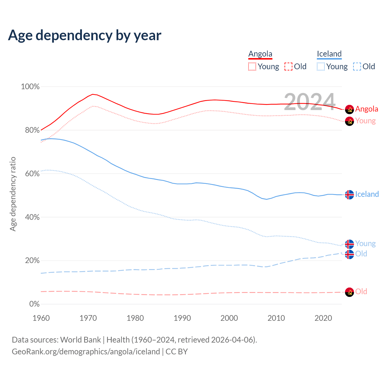 - Angola is ranked 188/196 by median age (oldest to youngest) vs 65/196 for Iceland.