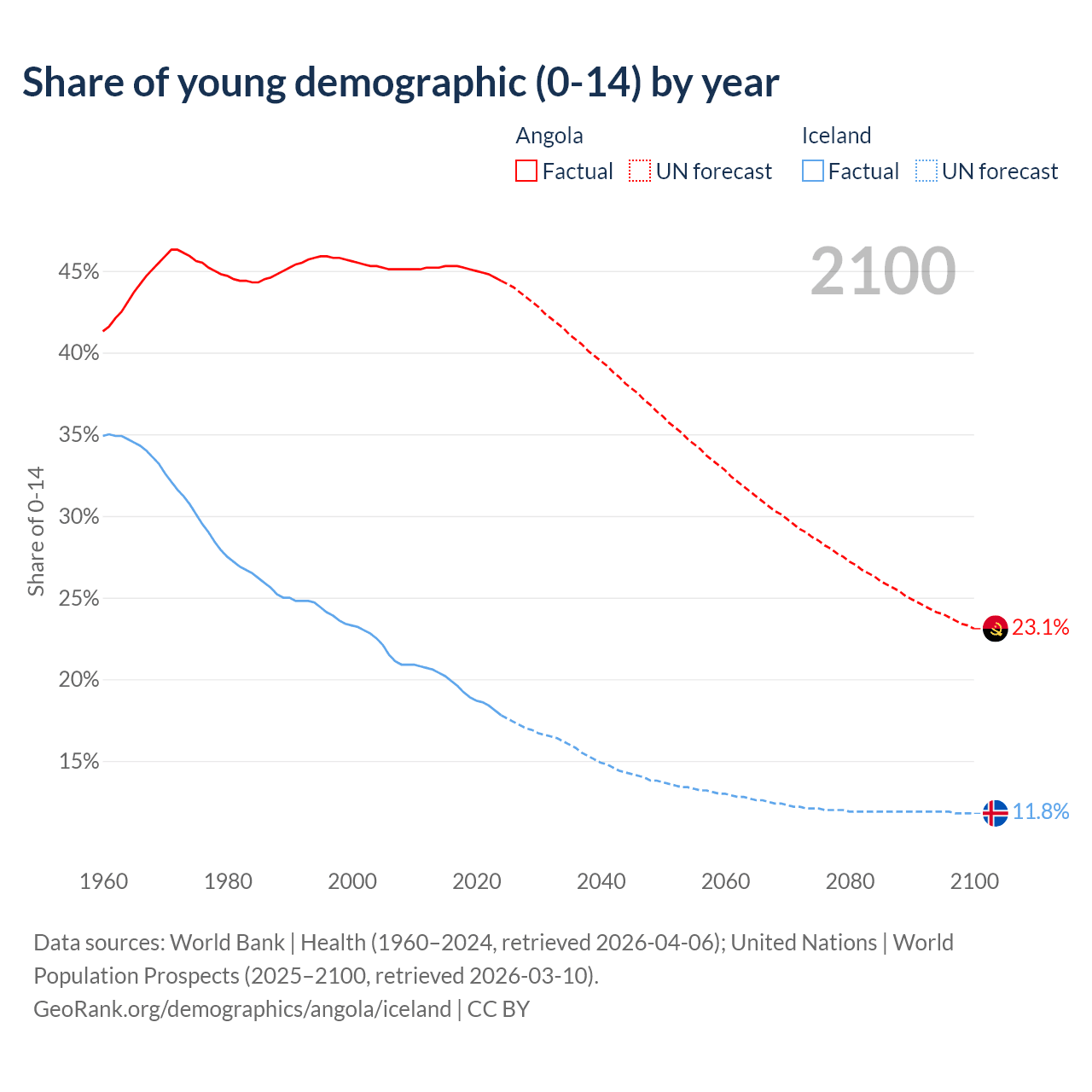 - The share of young demographic (0-15 years old) in Angola is 44.4% vs 17.8% in Iceland.