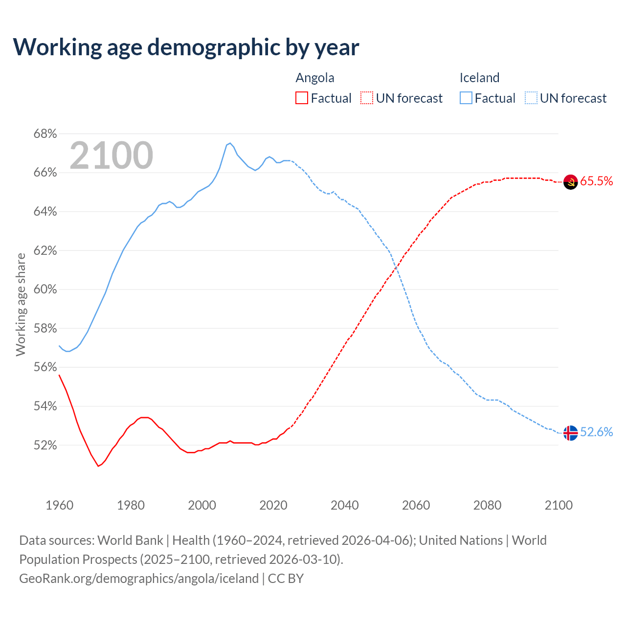 - Angola has 21.4M working age adults (aged 15-64) vs 264K in Iceland.