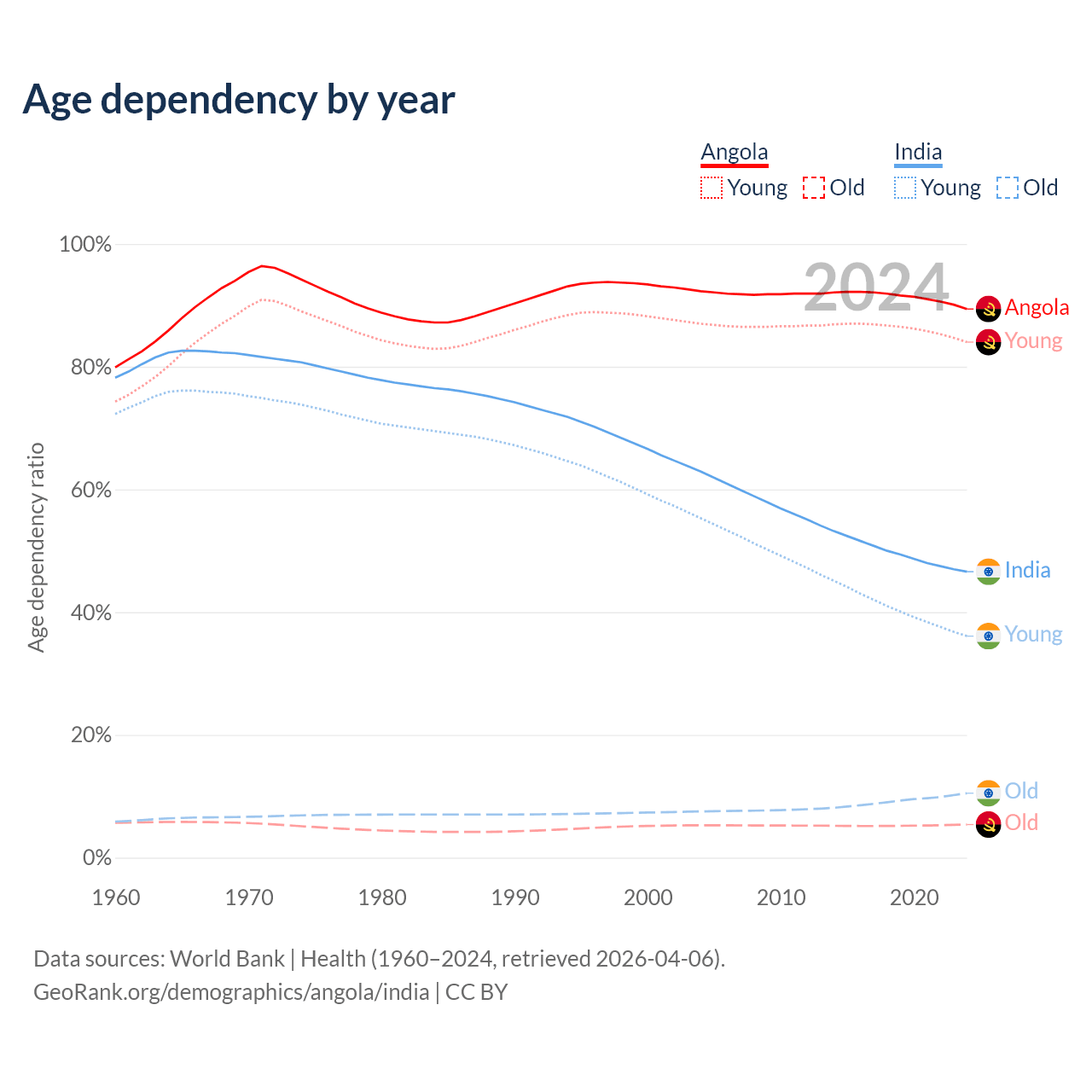 - Angola is ranked 188/196 by median age (oldest to youngest) vs 108/196 for India.