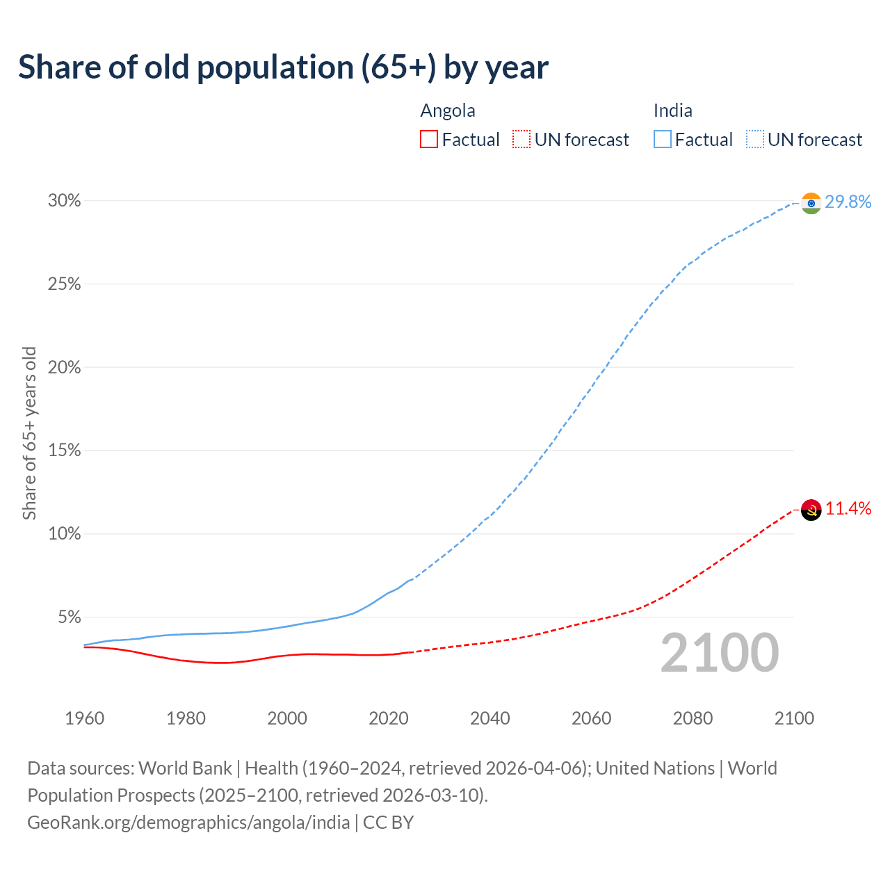 The share of older people aged 65 and over is 2.85% in Angola and 7.15% in India. Life expectancy in Angola compared to India .