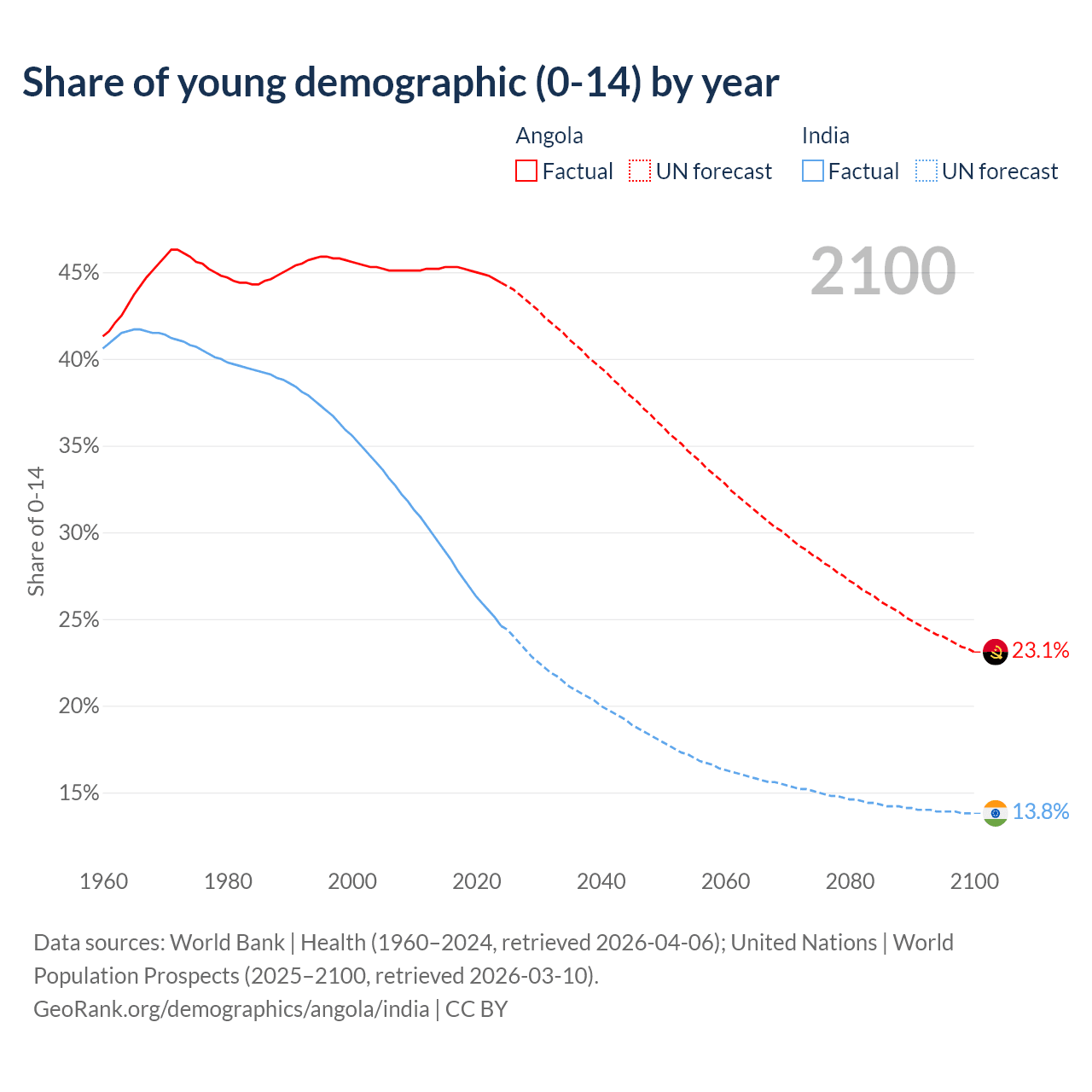 - The share of young demographic (0-15 years old) in Angola is 44.4% vs 24.6% in India.