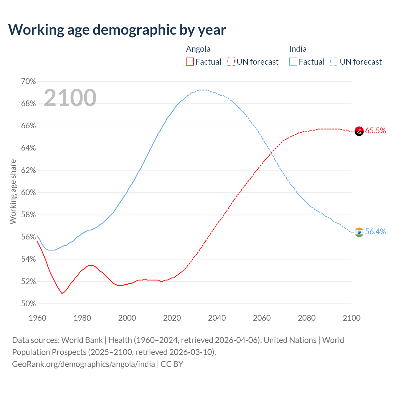 - Angola has 21.4M working age adults (aged 15-64) vs 1.01B in India.