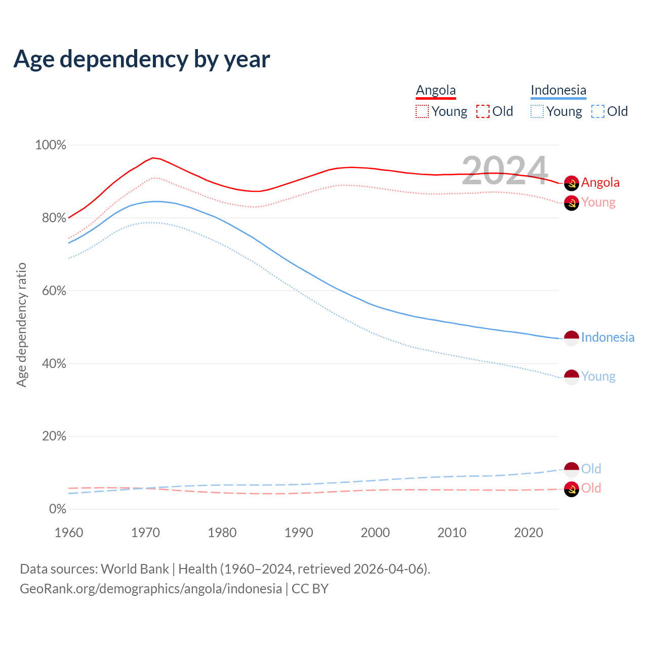 - Angola is ranked 188/196 by median age (oldest to youngest) vs 93/196 for Indonesia.