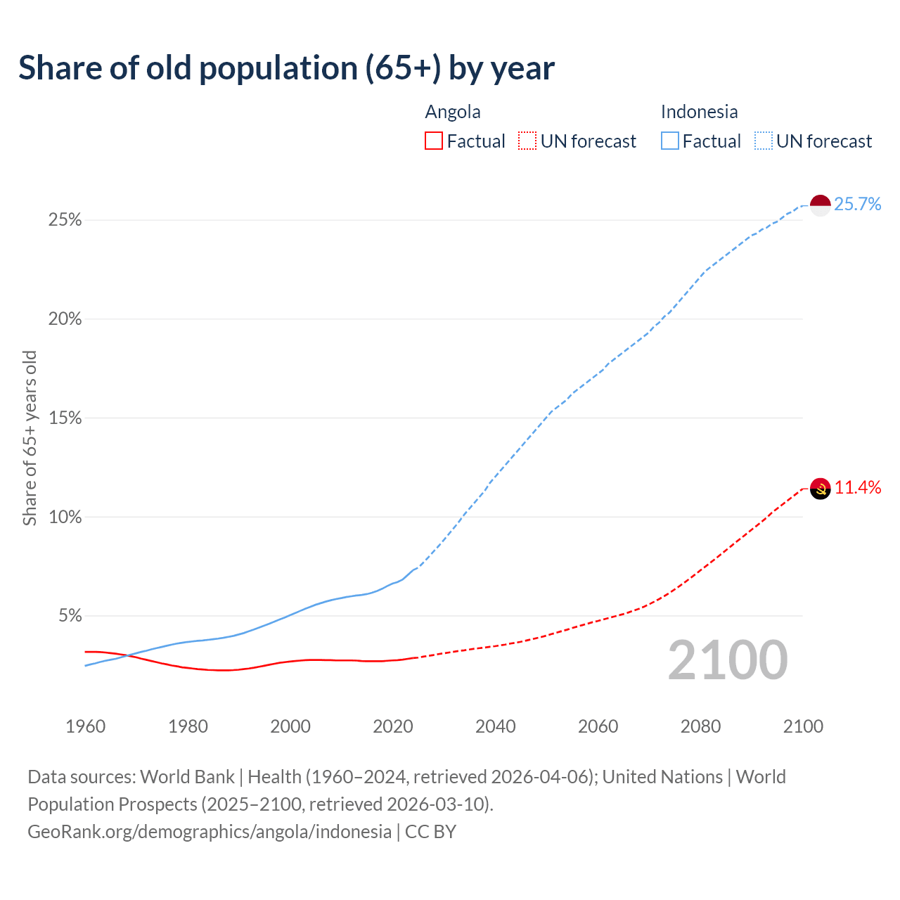 The share of older people aged 65 and over is 2.85% in Angola and 7.29% in Indonesia. Life expectancy in Angola compared to Indonesia .