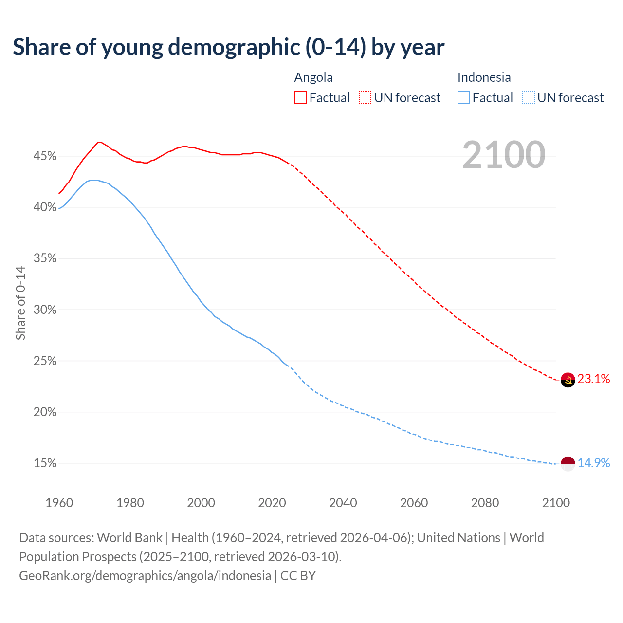 - The share of young demographic (0-15 years old) in Angola is 44.4% vs 24.6% in Indonesia.