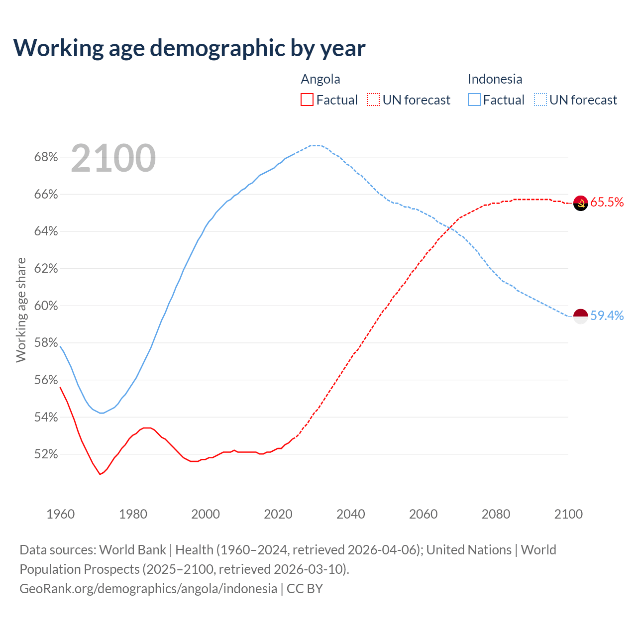 - Angola has 21.4M working age adults (aged 15-64) vs 197M in Indonesia.