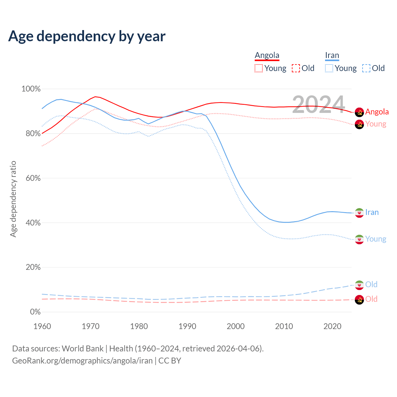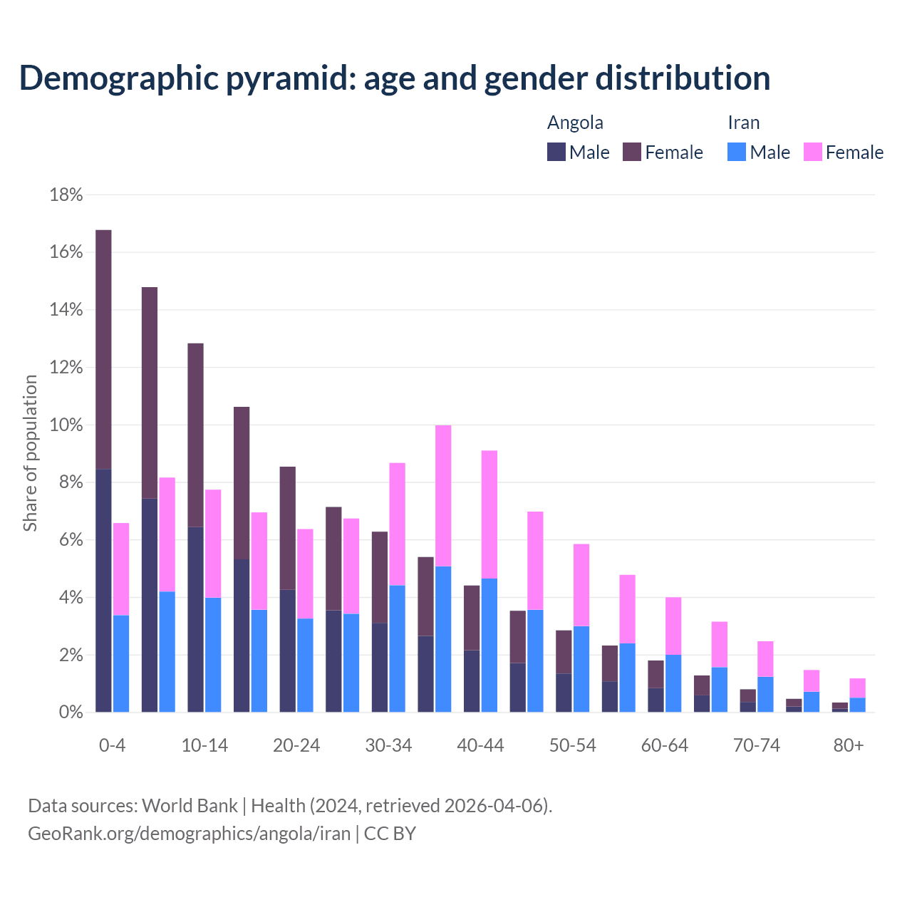 - Angola is ranked 188/196 by median age (oldest to youngest) vs 79/196 for Iran.