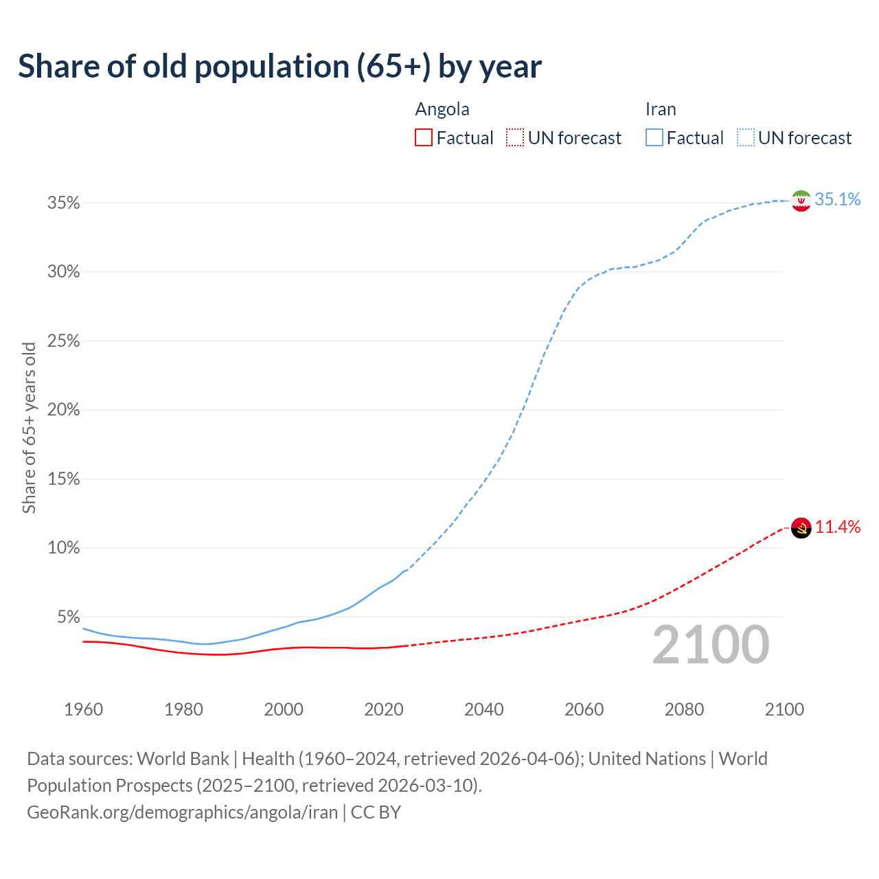 The share of older people aged 65 and over is 2.85% in Angola and 8.24% in Iran. Life expectancy in Angola compared to Iran .