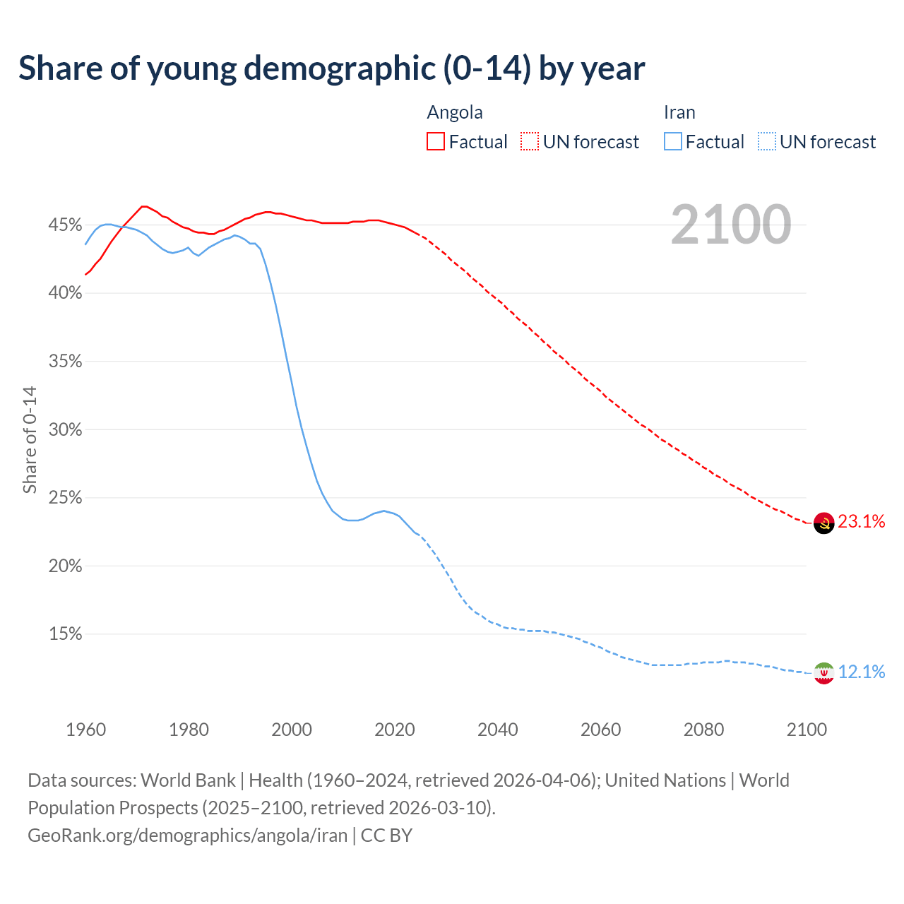 - The share of young demographic (0-15 years old) in Angola is 44.4% vs 22.4% in Iran.