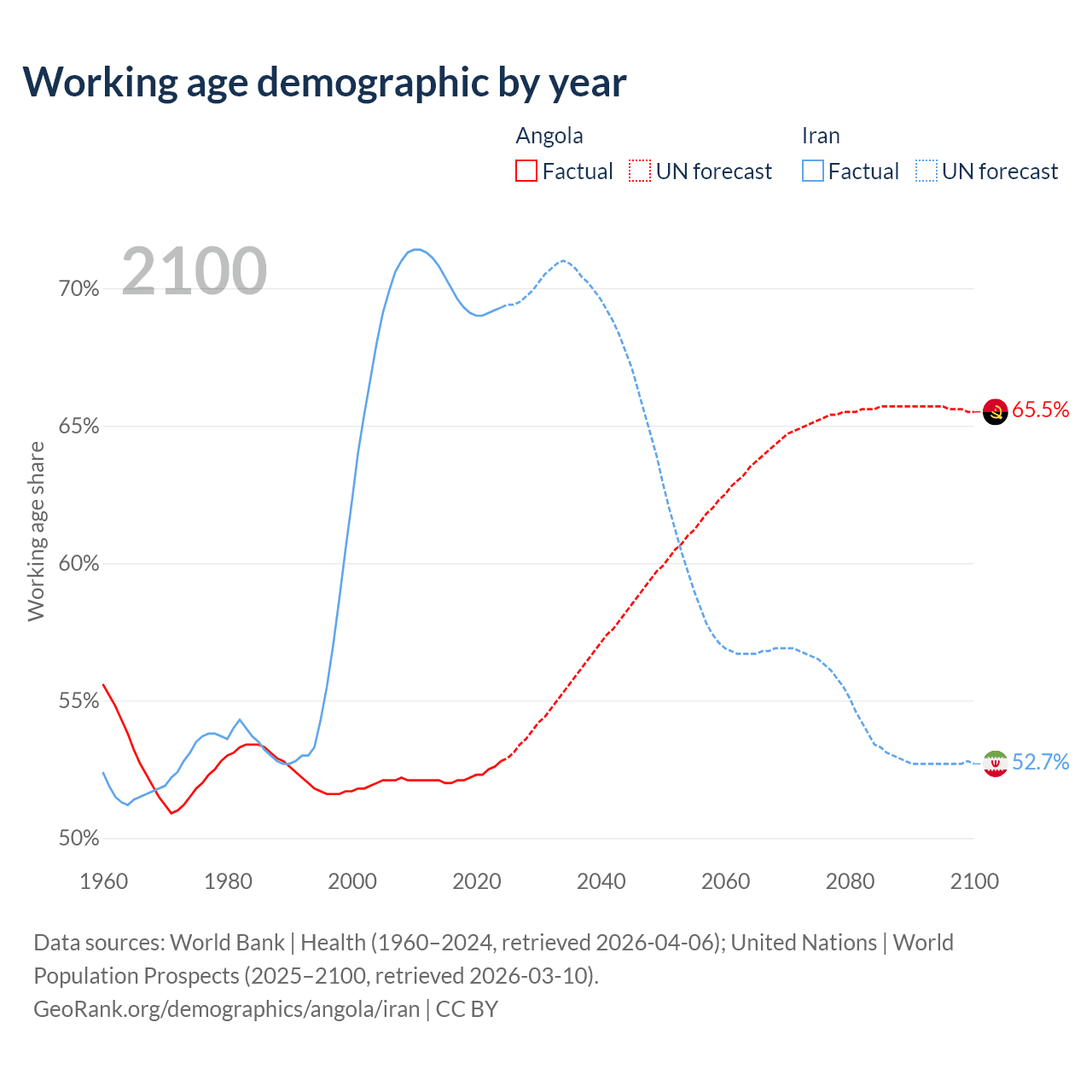 - Angola has 21.4M working age adults (aged 15-64) vs 64.8M in Iran.