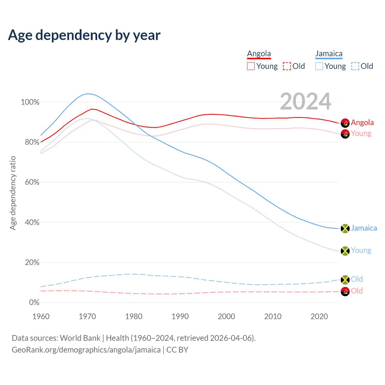 Data sources: World Bank | Health (1960–2024, retrieved 2026-04-06); U.S. Census Bureau (1960–2024, retrieved 2026-02-08).