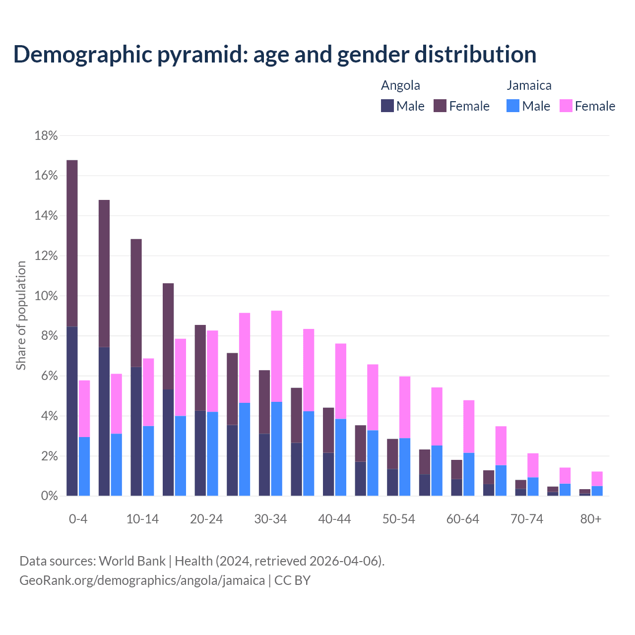 - The share of old-age demographic (65+) in Angola is 2.85% vs 8.21% in Jamaica.