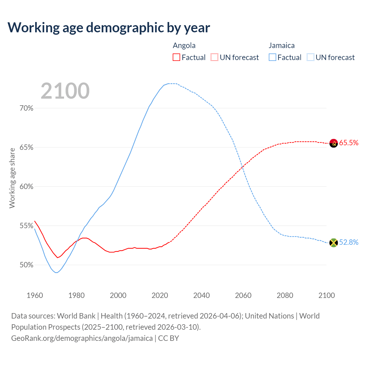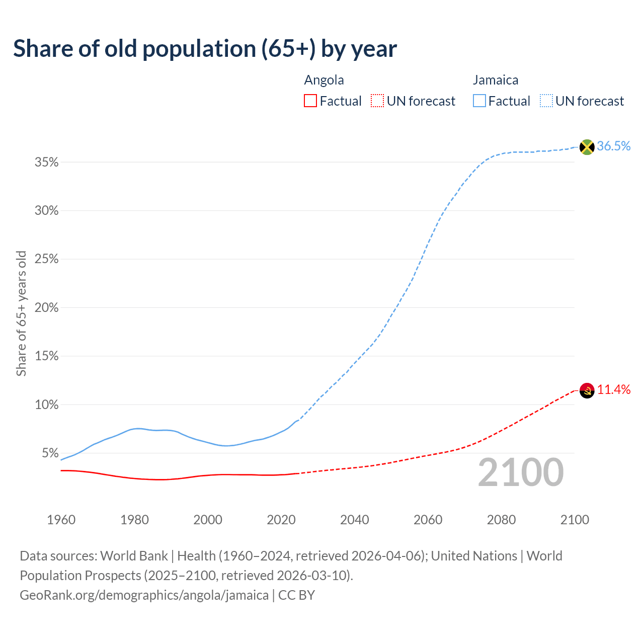 The share of older people aged 65 and over is 2.85% in Angola and 8.21% in Jamaica. Life expectancy in Angola compared to Jamaica .