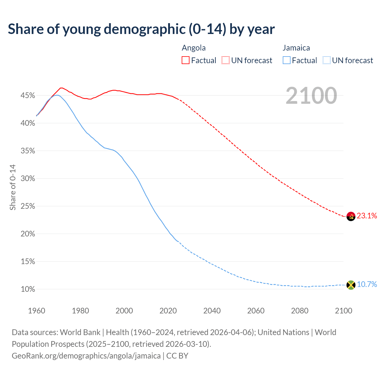 - The share of young demographic (0-15 years old) in Angola is 44.4% vs 18.7% in Jamaica.