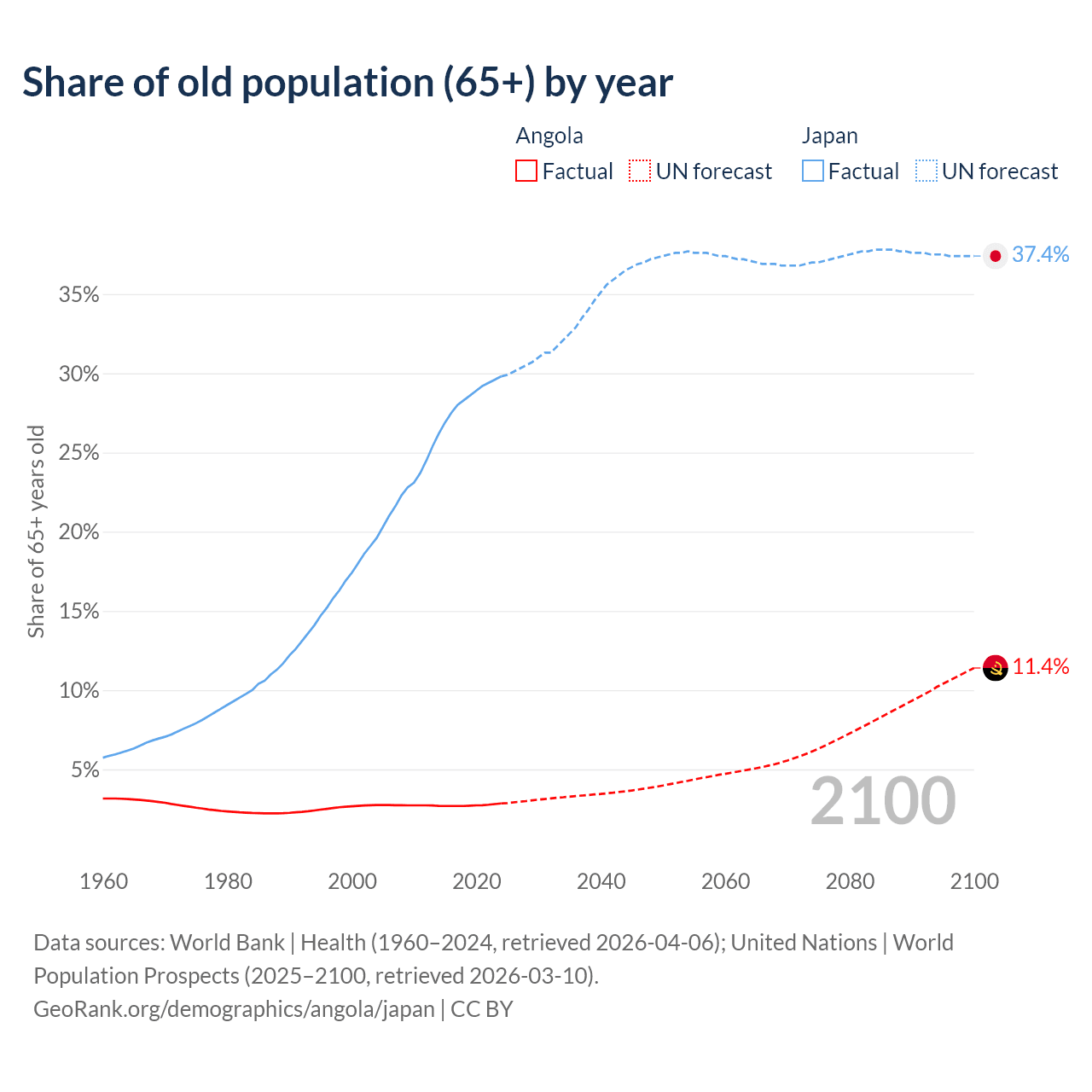 The share of older people aged 65 and over is 2.85% in Angola and 29.8% in Japan. Life expectancy in Angola compared to Japan .