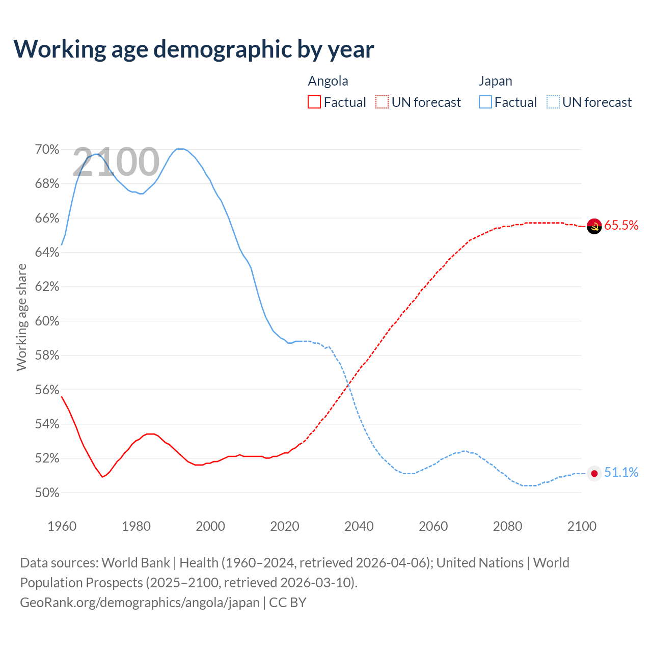 - Angola has 21.4M working age adults (aged 15-64) vs 72.1M in Japan.