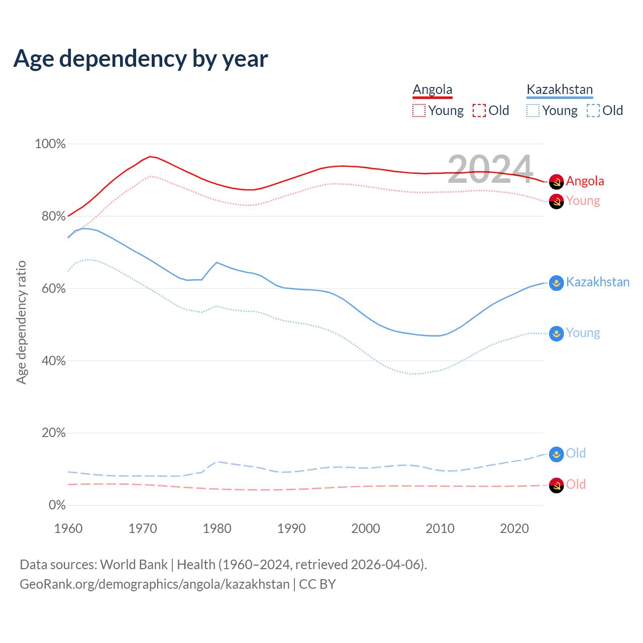Data sources: World Bank | Health (1960–2024, retrieved 2026-04-06); U.S. Census Bureau (1960–2024, retrieved 2026-02-08).