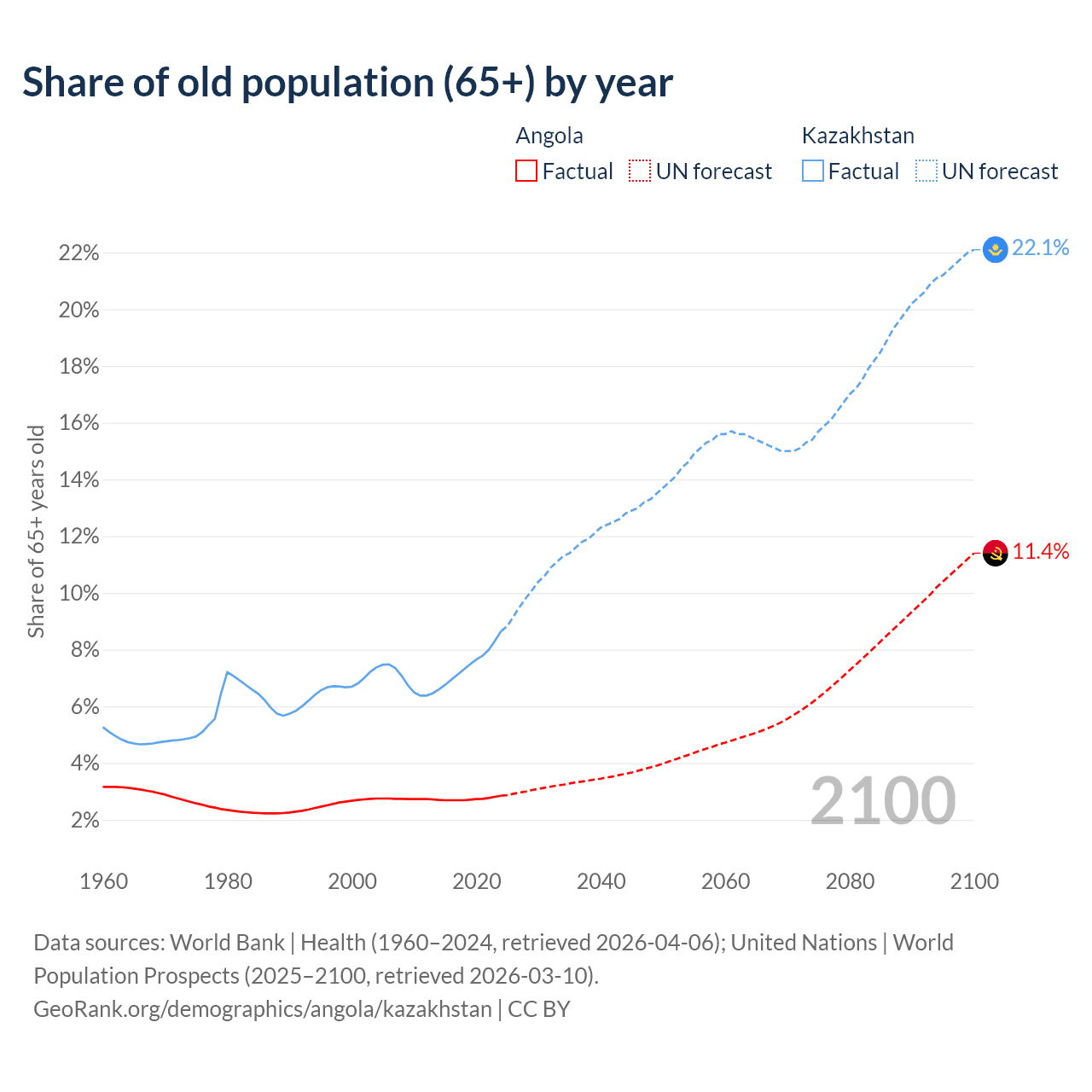 The share of older people aged 65 and over is 2.85% in Angola and 8.65% in Kazakhstan. Life expectancy in Angola compared to Kazakhstan .