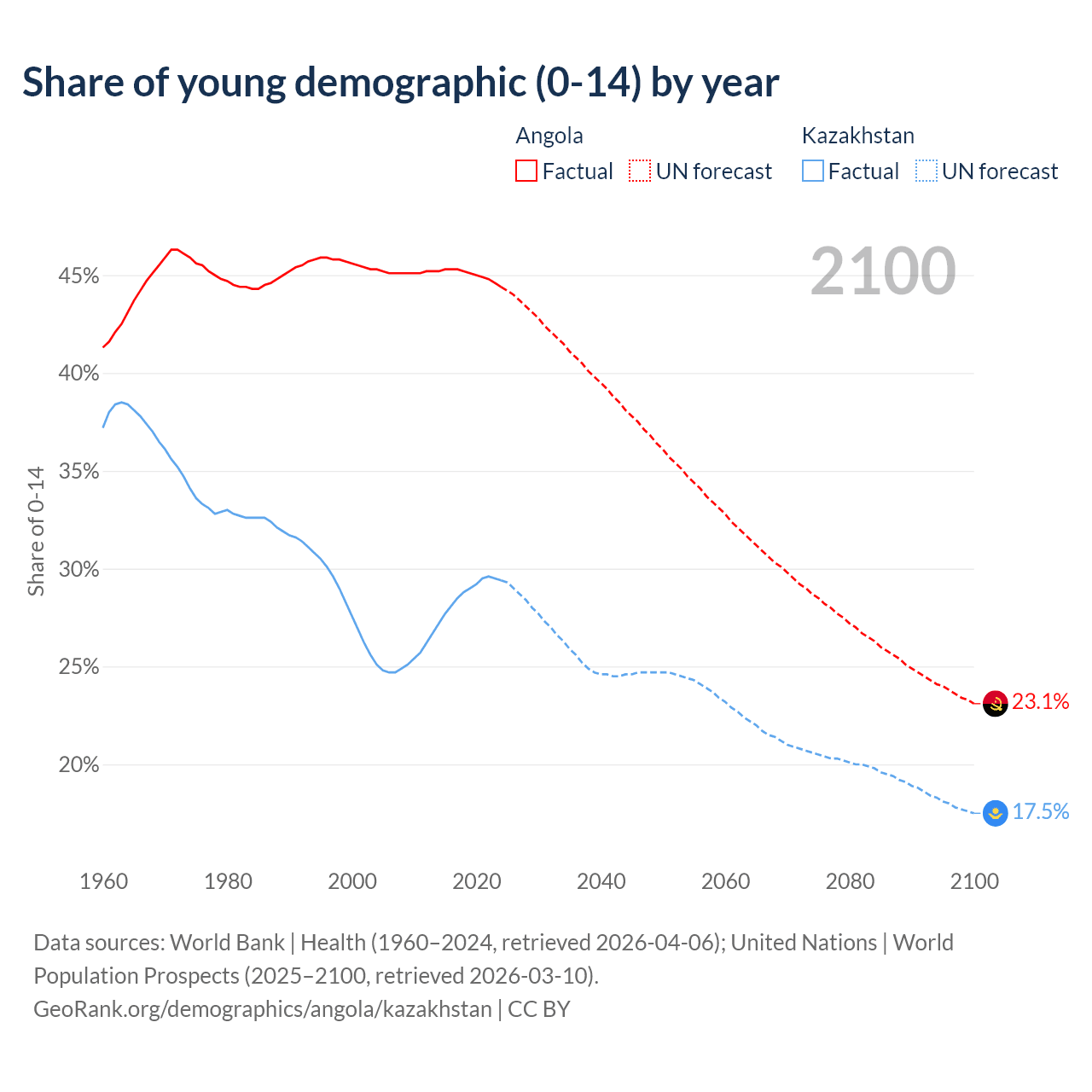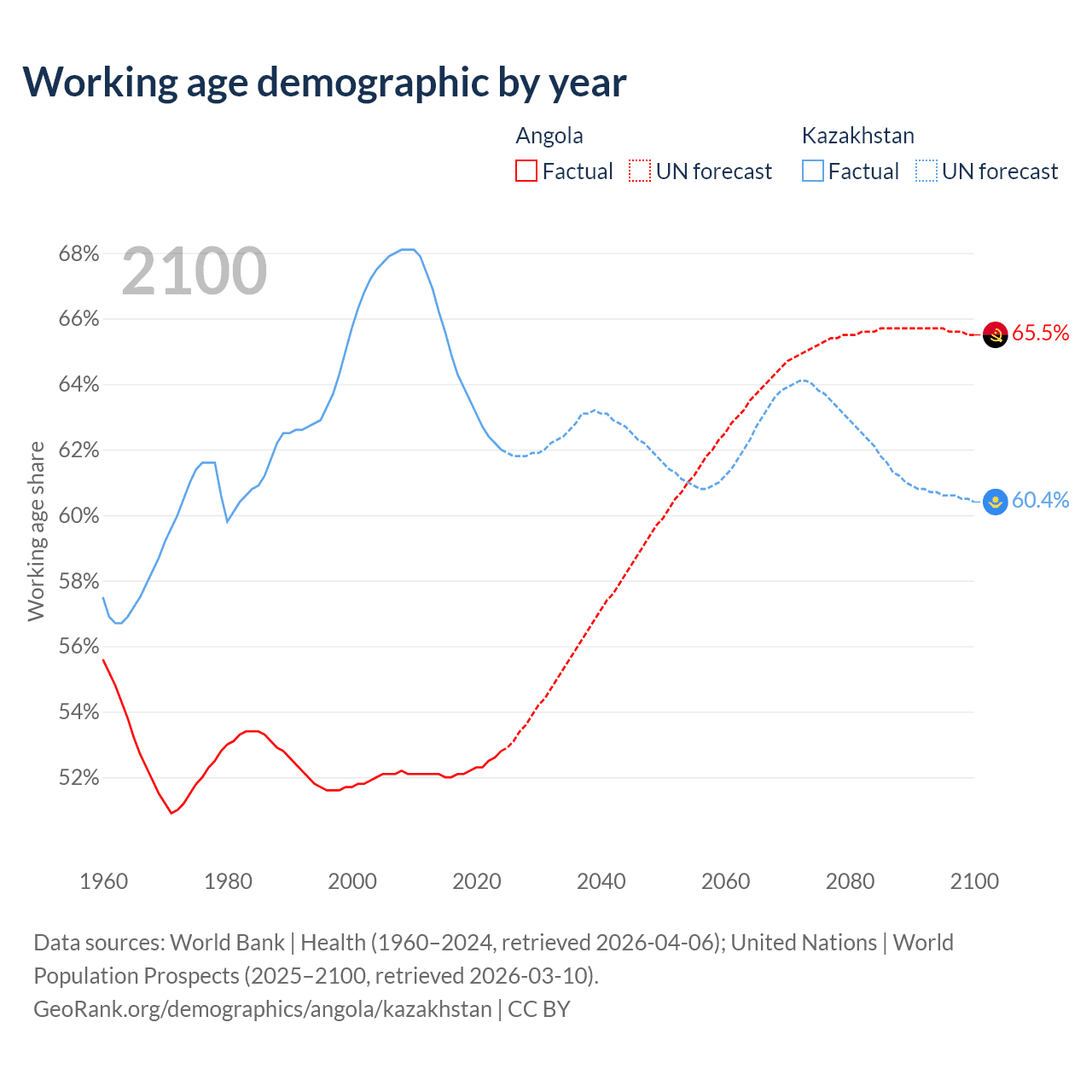 Median age Angola vs Kazakhstan, 1960-2100