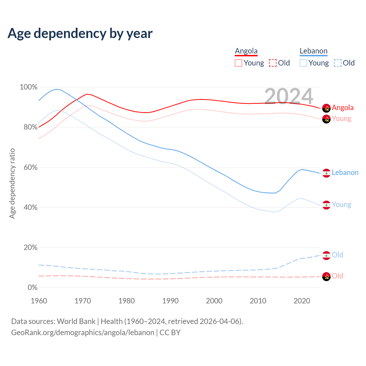 - Angola is ranked 188/196 by median age (oldest to youngest) vs 106/196 for Lebanon.