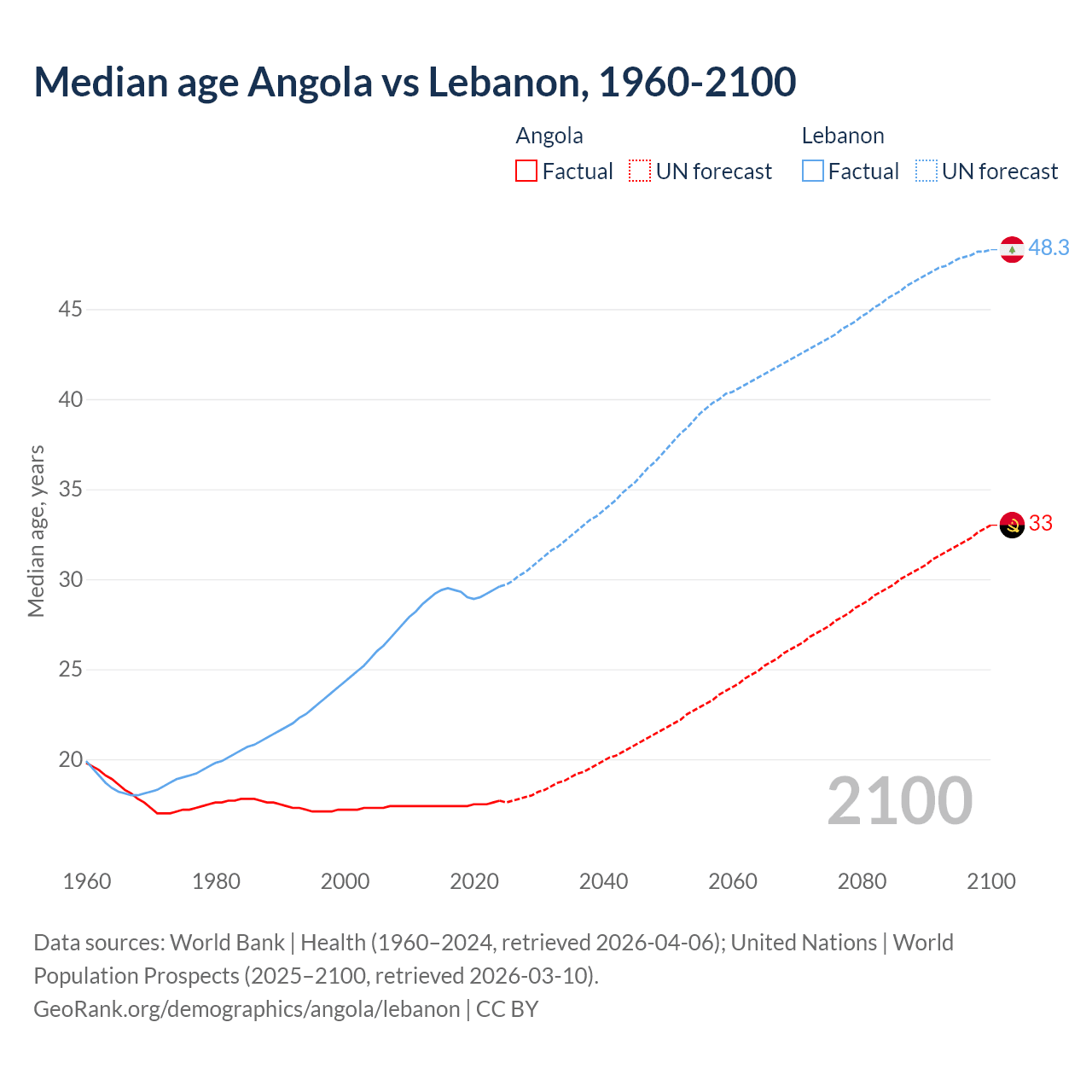 Median age Angola vs Lebanon, 1960-2100