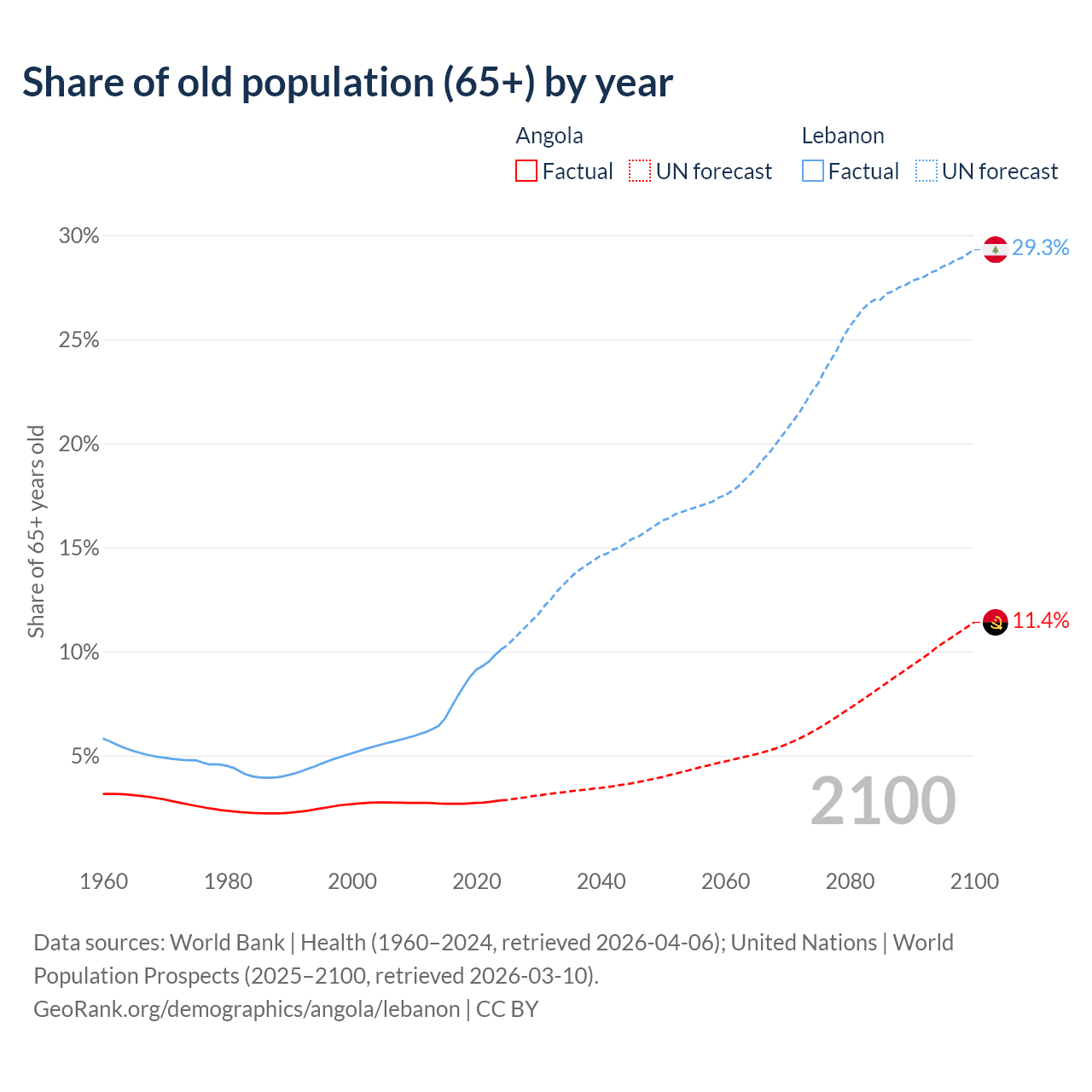 The share of older people aged 65 and over is 2.85% in Angola and 10.1% in Lebanon. Life expectancy in Angola compared to Lebanon .