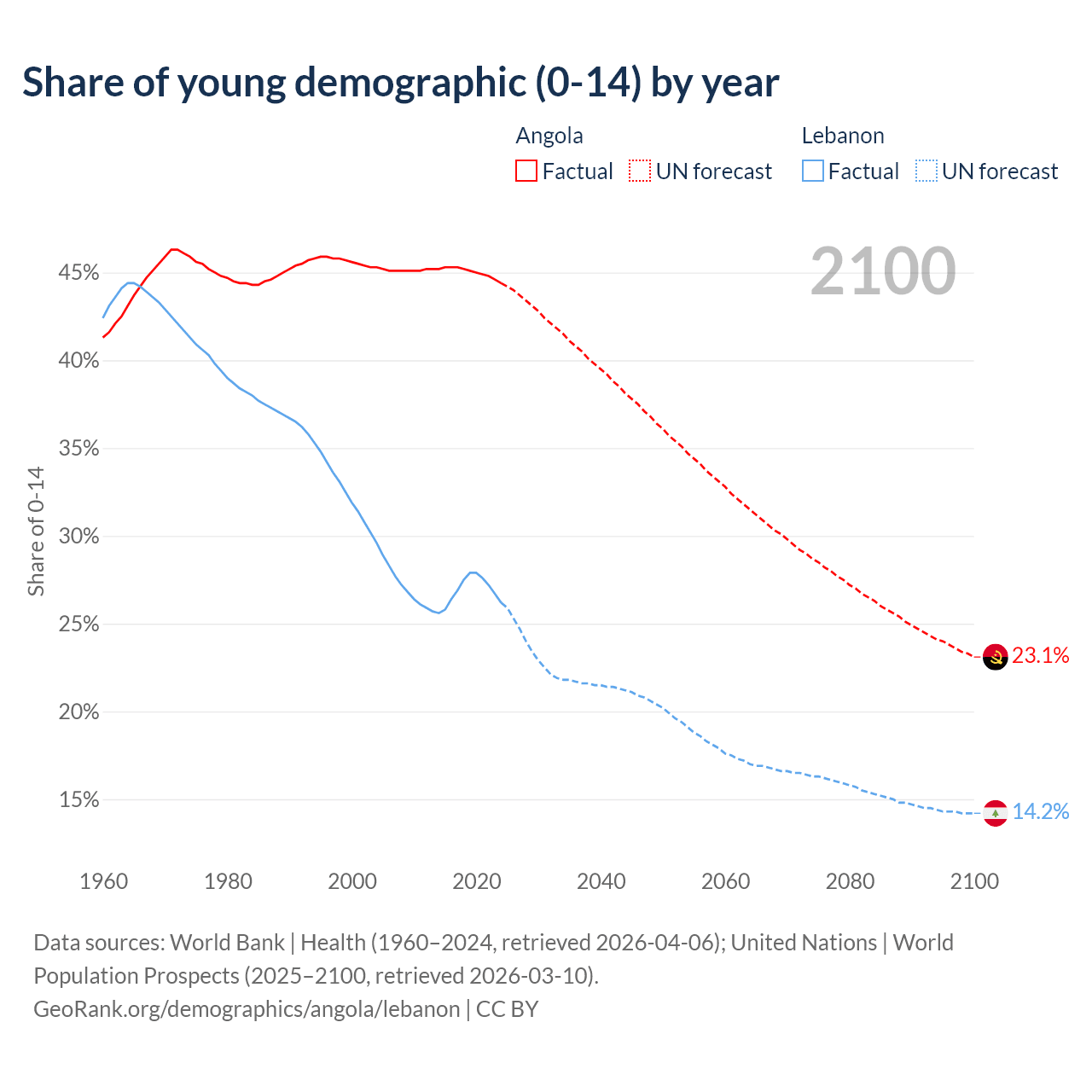 - The share of young demographic (0-15 years old) in Angola is 44.4% vs 26.2% in Lebanon.