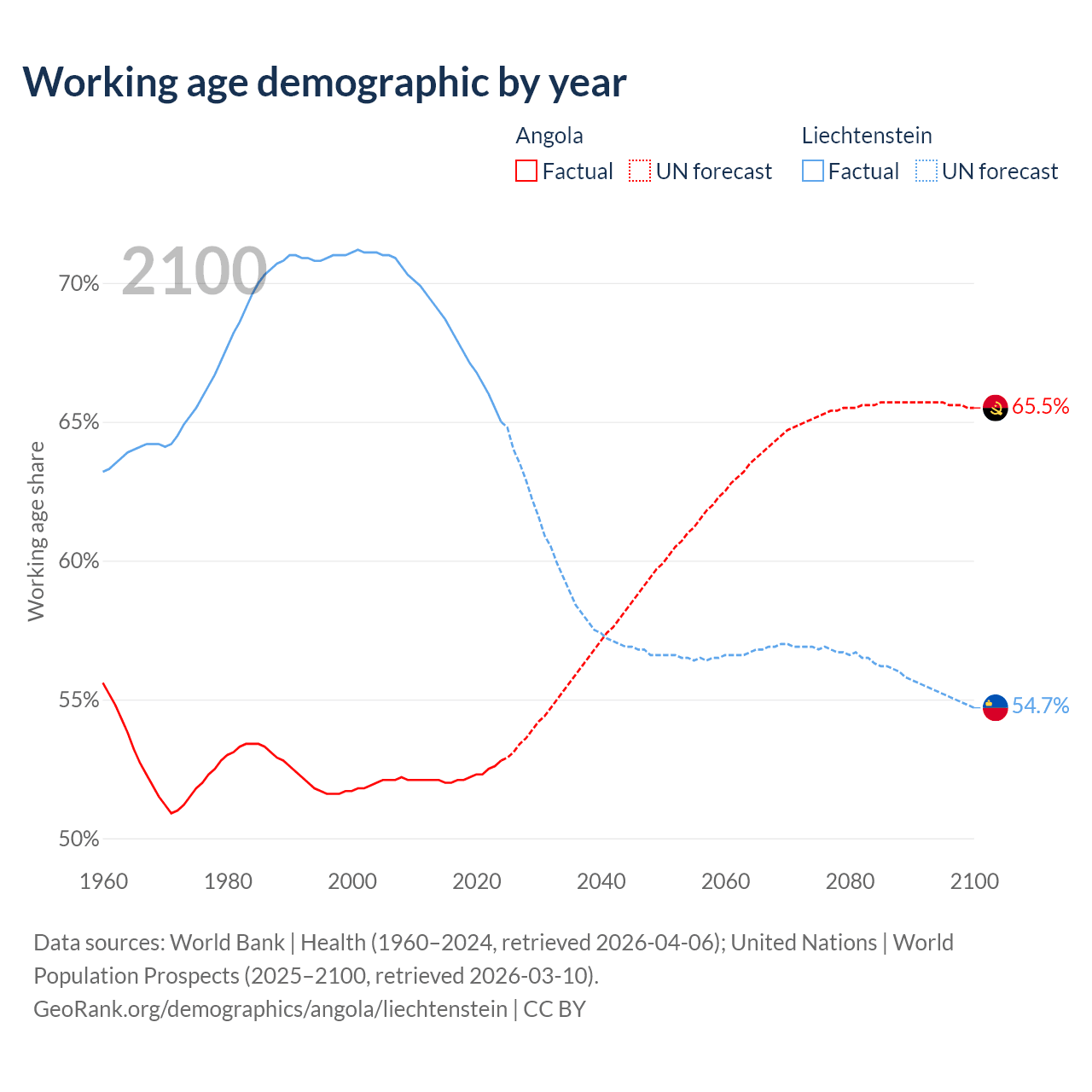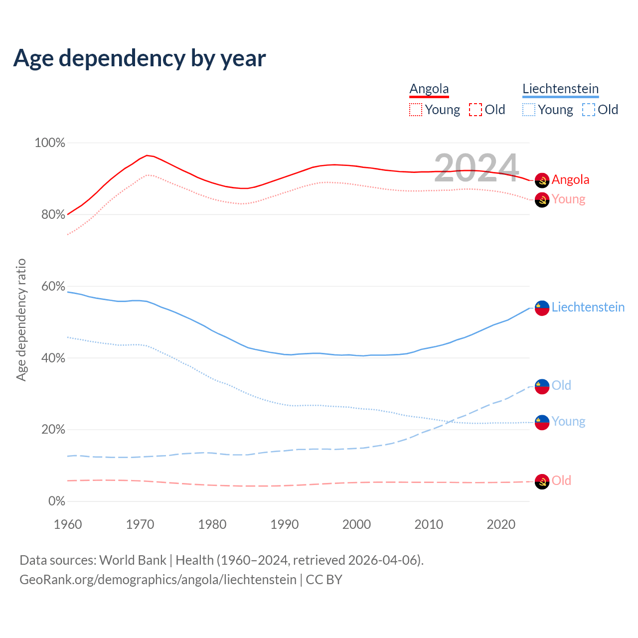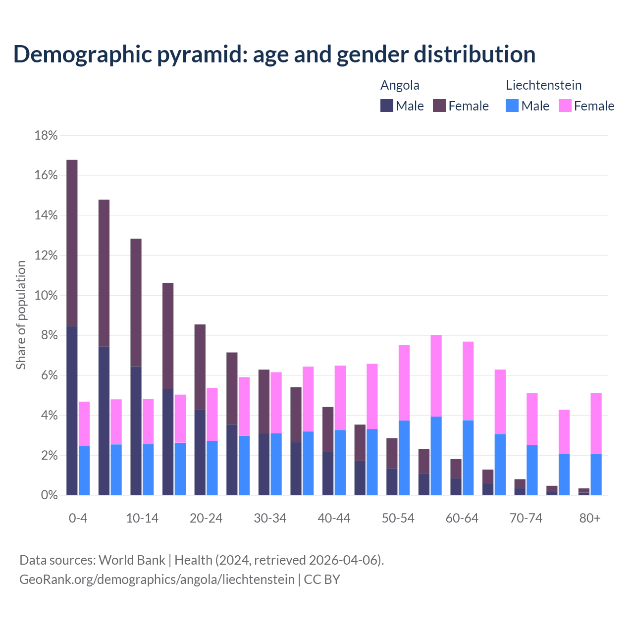 - The share of old-age demographic (65+) in Angola is 2.85% vs 20.7% in Liechtenstein.