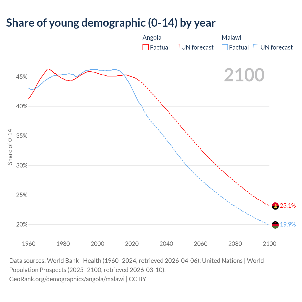 - The share of young demographic (0-15 years old) in Angola is 44.4% vs 40.7% in Malawi.